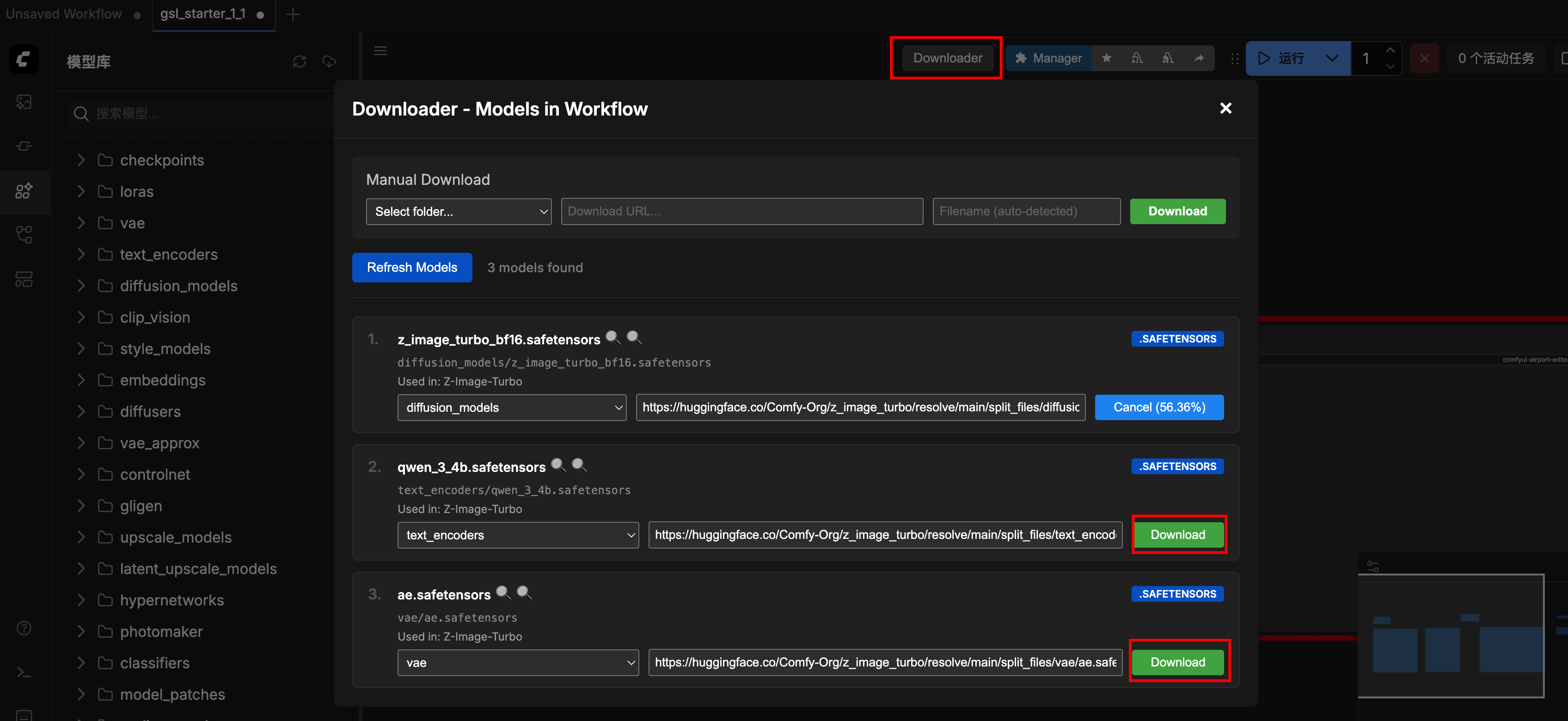 选择一个模板后,点击 Downloader ,就会自动识别这个模板依赖的模型,然后点击下载即可。