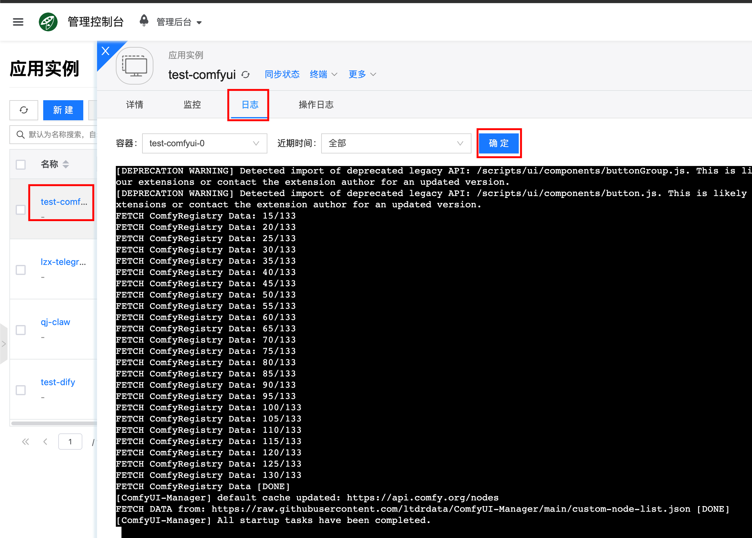 通过前端界面:点击对应的应用实例,进入详情页面 ,再点击日志,就能查看到服务输出的日志了,方便用于错误排查。
