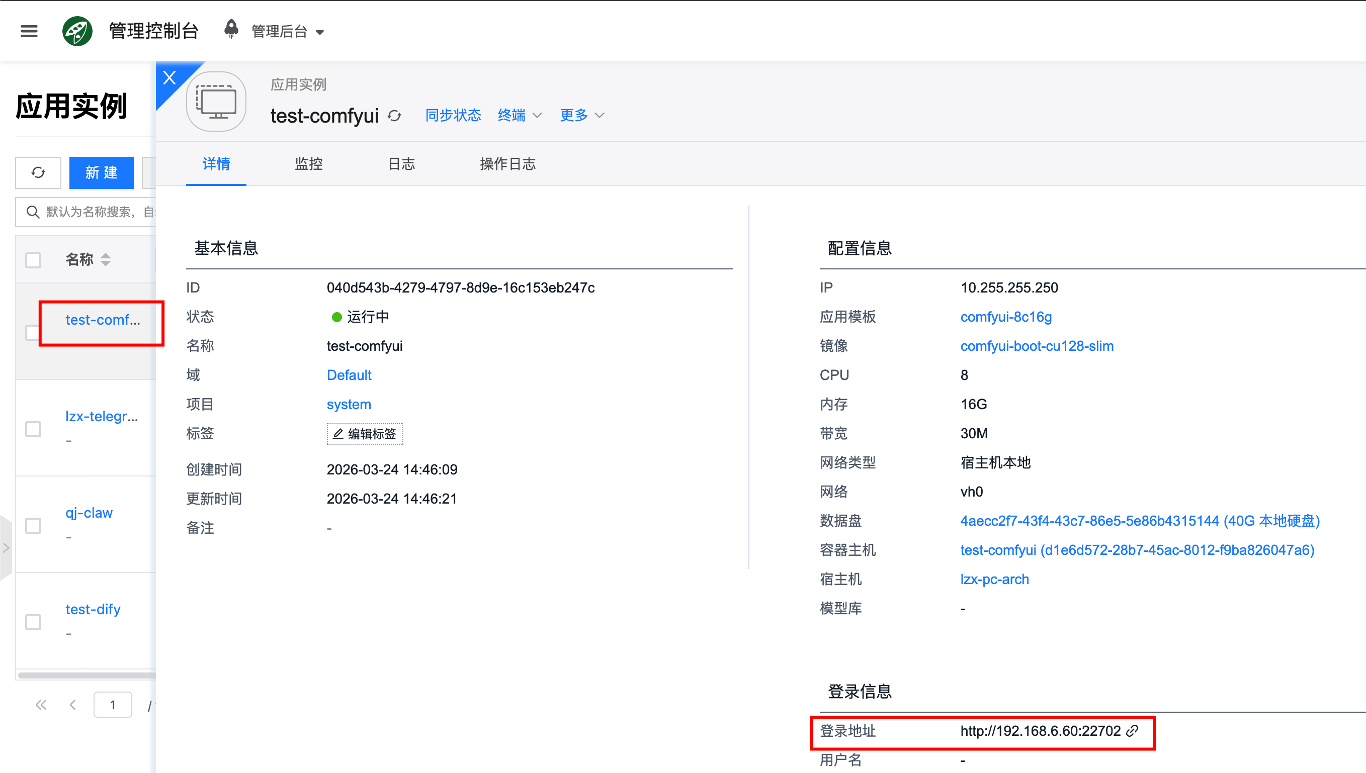 创建完成后,进入实例详情页面,即可获取登录信息,通过浏览器打开对应地址,就能打开 ComfyUI Web 界面。