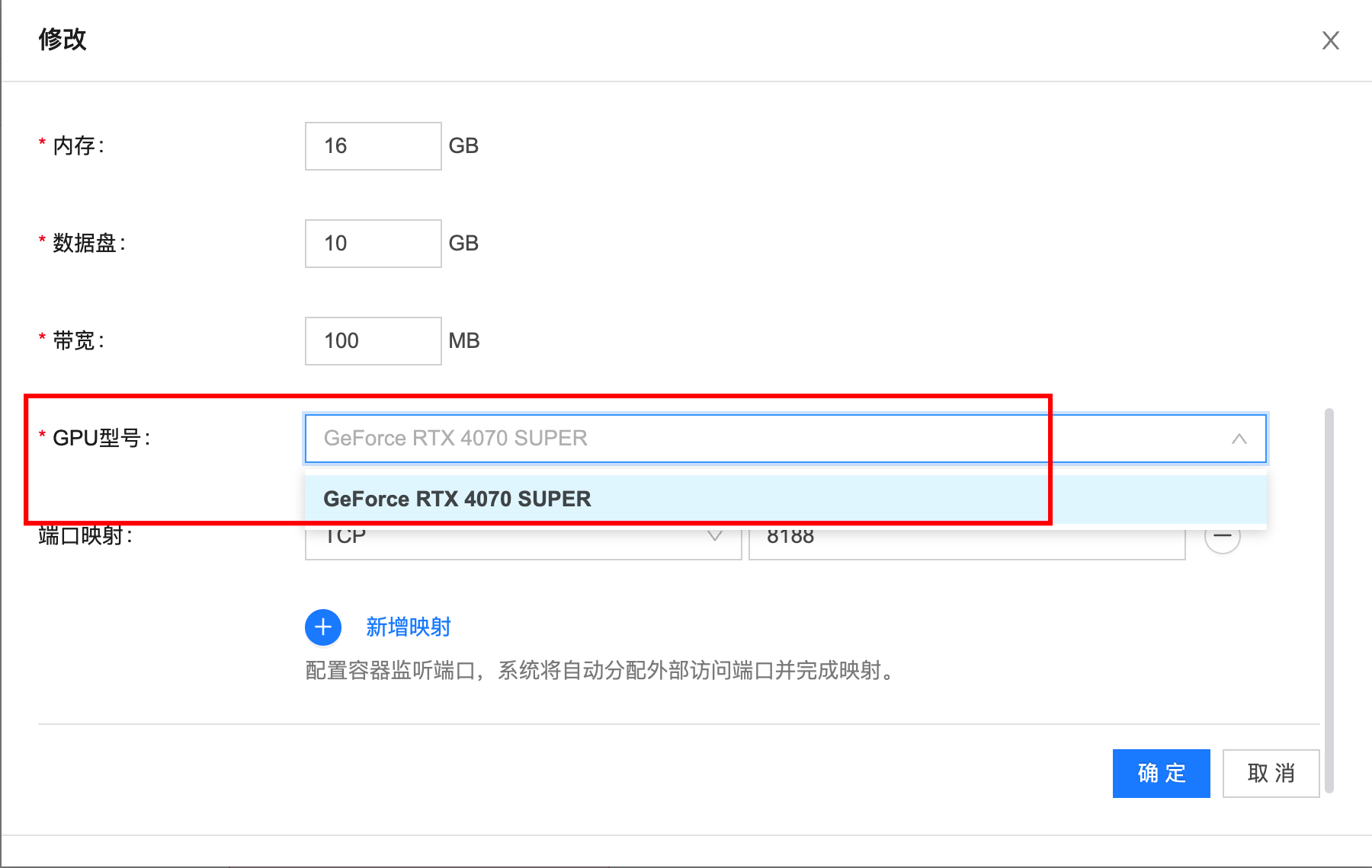 - 在模板配置中,将 GPU 型号改成你当前要使用的型号;