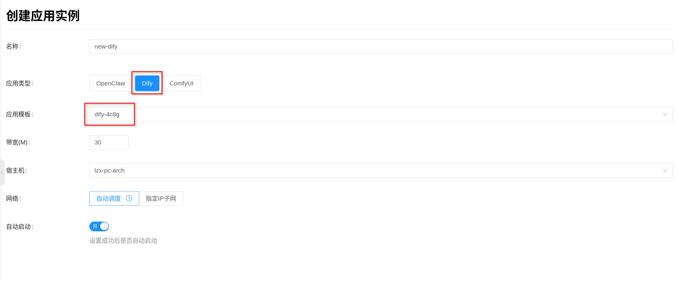 Dify对应的应用模板或应用类型。 - 填写实例名称,并按页面要求选择项目、区域、网络等通用配置。