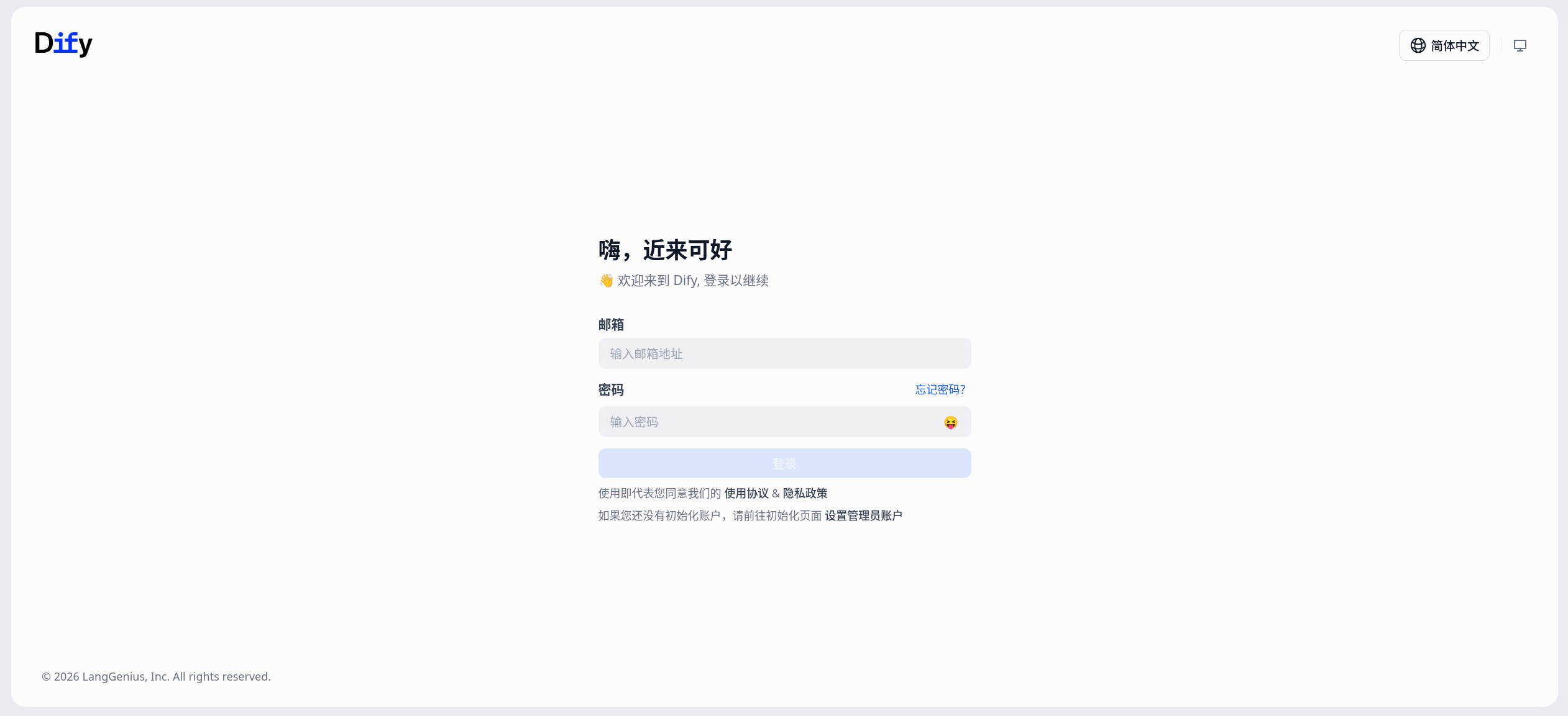 通过浏览器打开访问地址后,通常会看到 Dify 的首次初始化向导。你可以按页面提示完成以下动作: