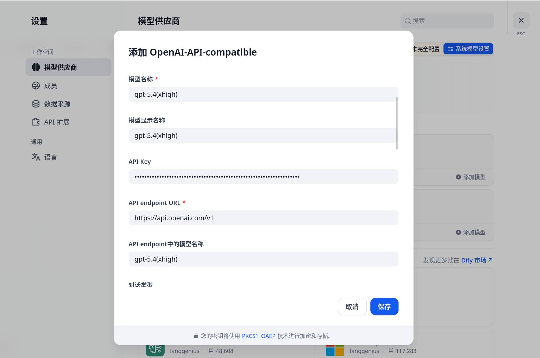 OpenAI或OpenAI-API-compatible插件;完成后在模型供应商页选择对应类型,再按页面要求填写官方地址或兼容服务的Base URL、模型名称与 API Key。