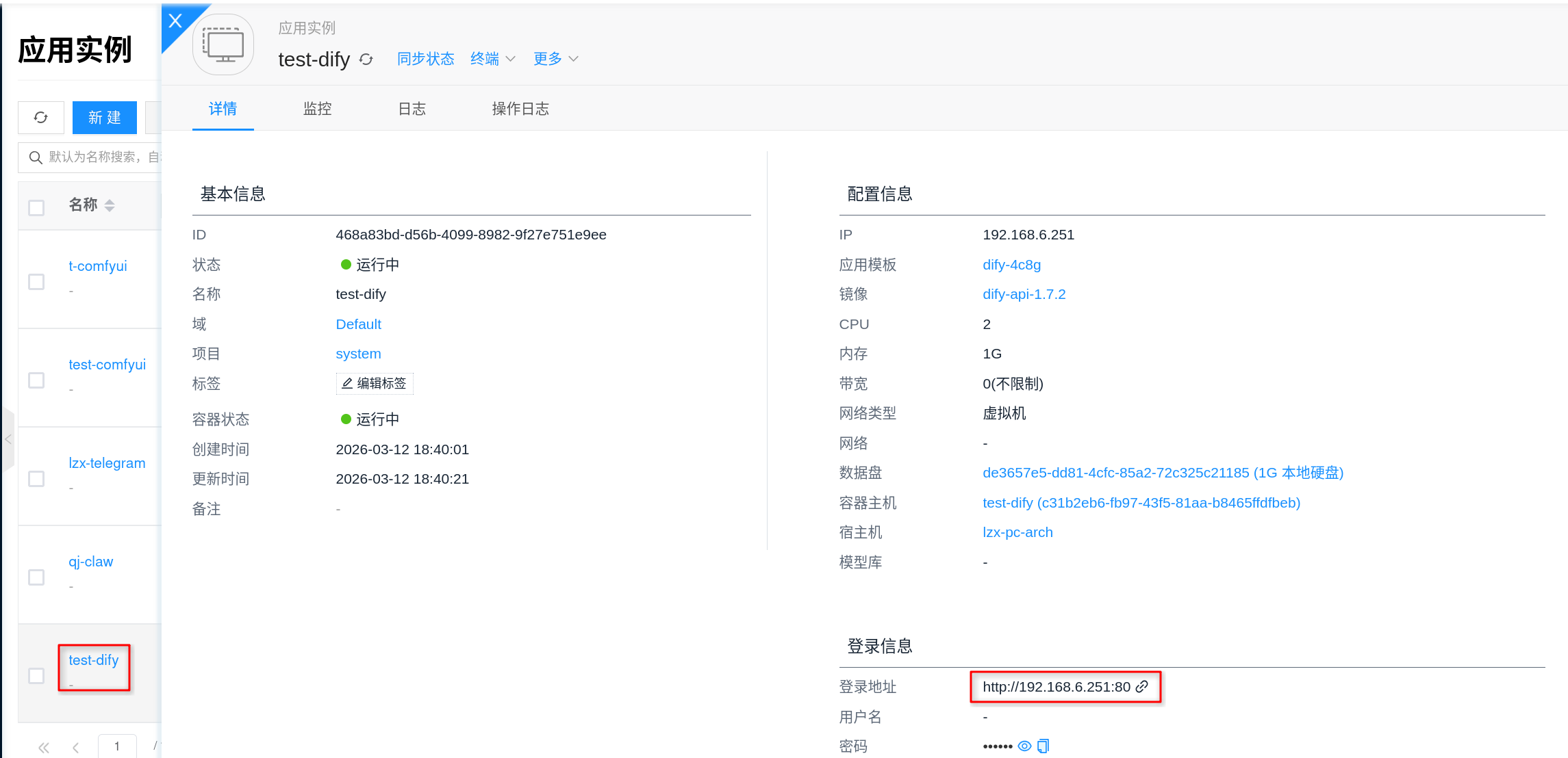实例创建成功后,进入实例详情页,打开 连接信息,即可获取 Dify 的访问地址。按当前平台实现,外部访问入口走 nginx 容器,对外默认暴露 80 端口。