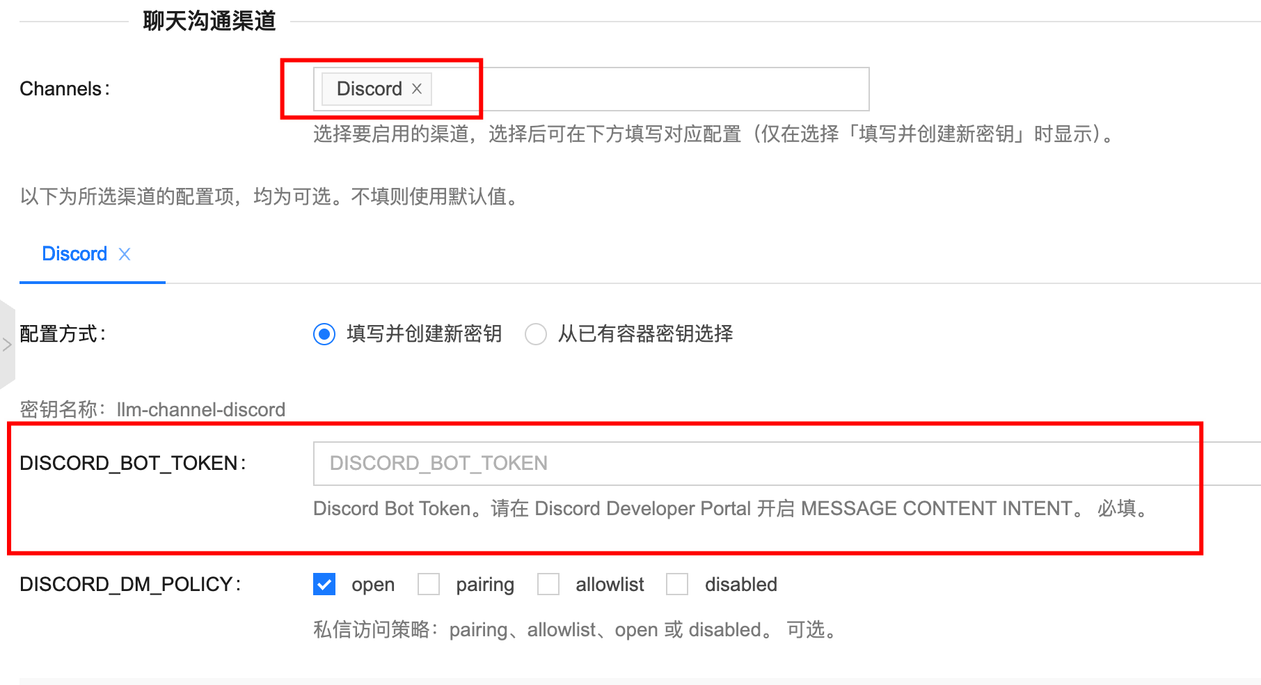 按需配置聊天沟通渠道(QQ、飞书、Telegram、Discord 等),填入对应的认证信息,用于通过聊天与 OpenClaw 交互。每个渠道配置获取认证信息的方式不一样,如何配置请参考:聊天沟通渠道配置。