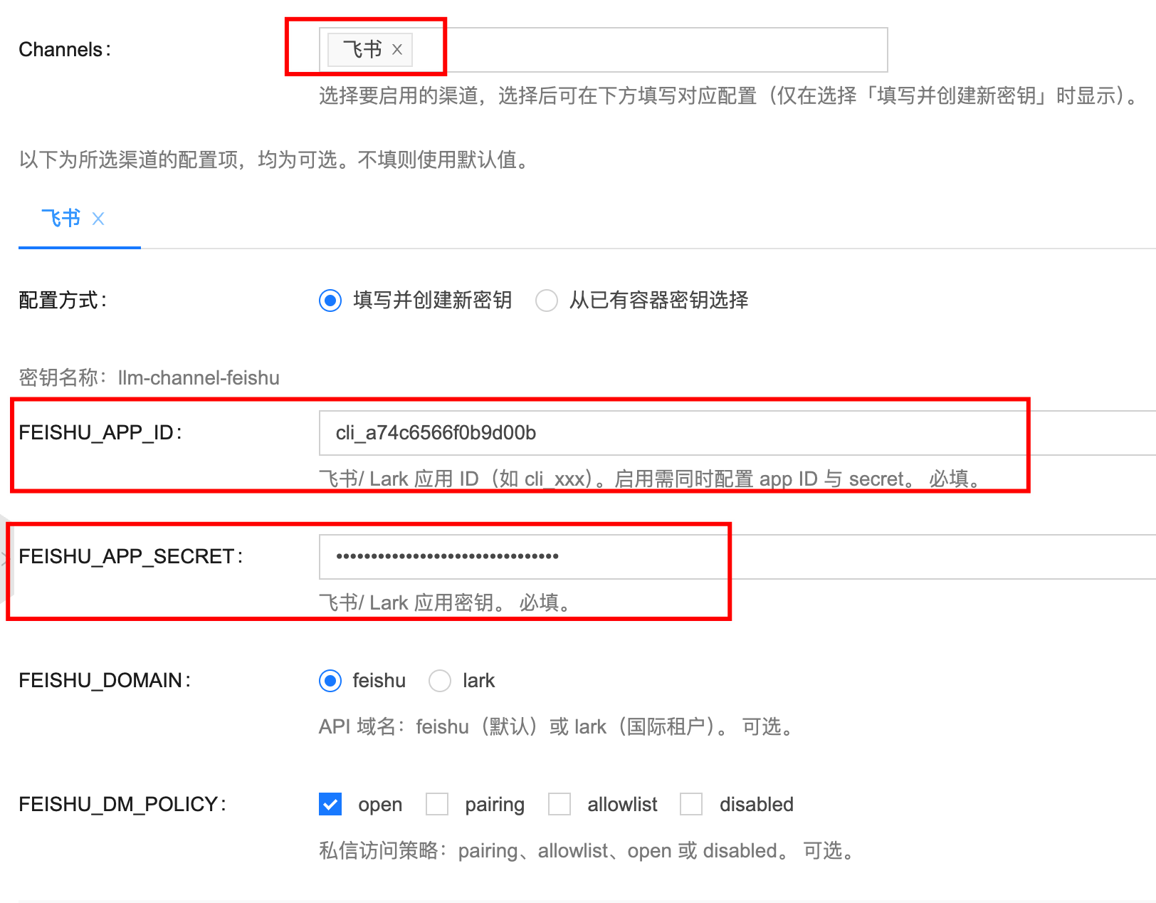 - AppID: 对应 FEISHU_APP_ID