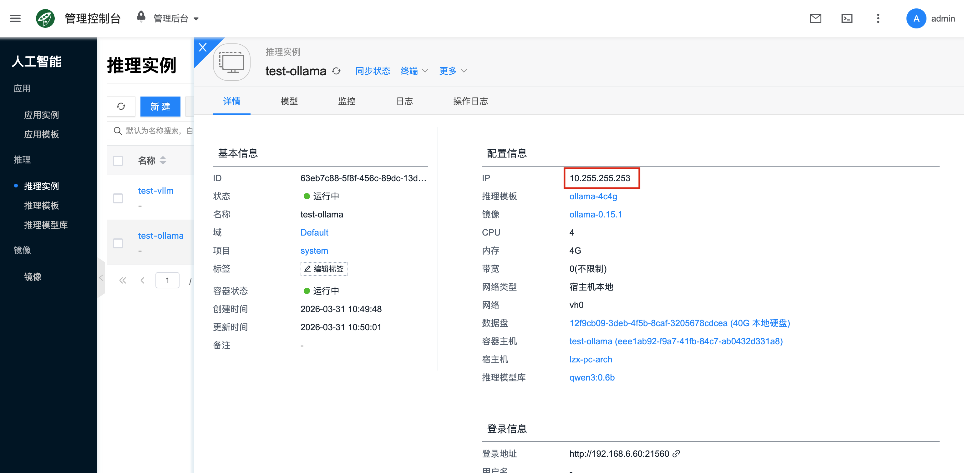 先在平台中准备一个可用的 Ollama 推理实例,具体创建方式参考 Ollama。