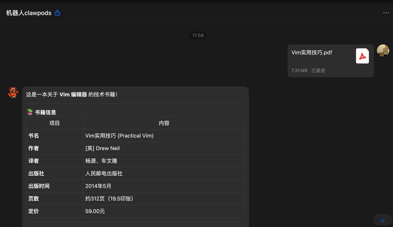 如果正确配置了 QQ 机器人聊天渠道,就可以在 QQ 里面和这个机器人发消息调用 OpenClaw 作为 AI 助手了,比如让他总结 pdf 文档: