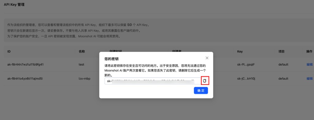 选择对应的供应商,并填入相关的 API Key,下图以 Moonshot(月之暗面) 为例:
