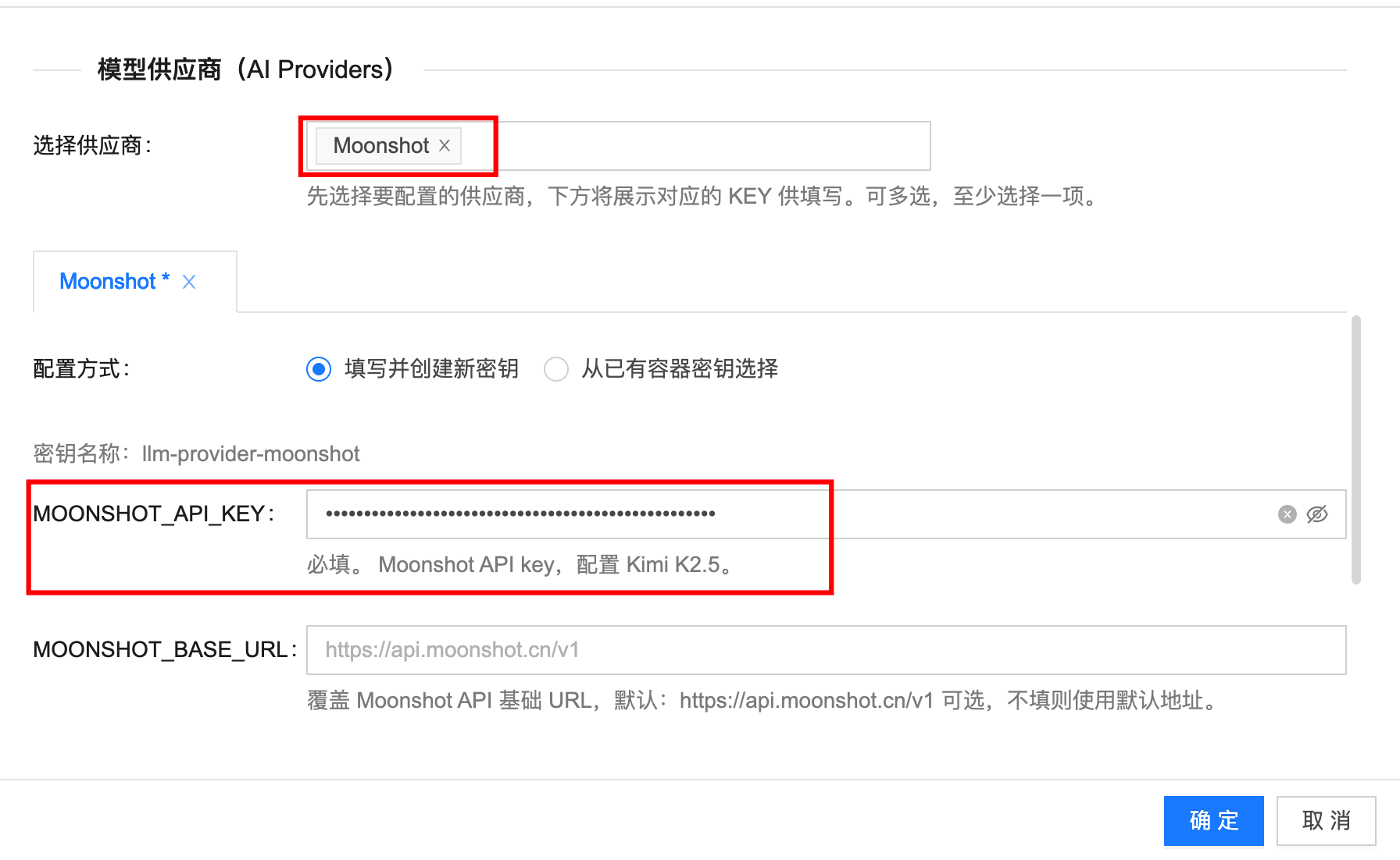 - 直接配置公有云或 SaaS 模型供应商的 API Key,例如 Moonshot。