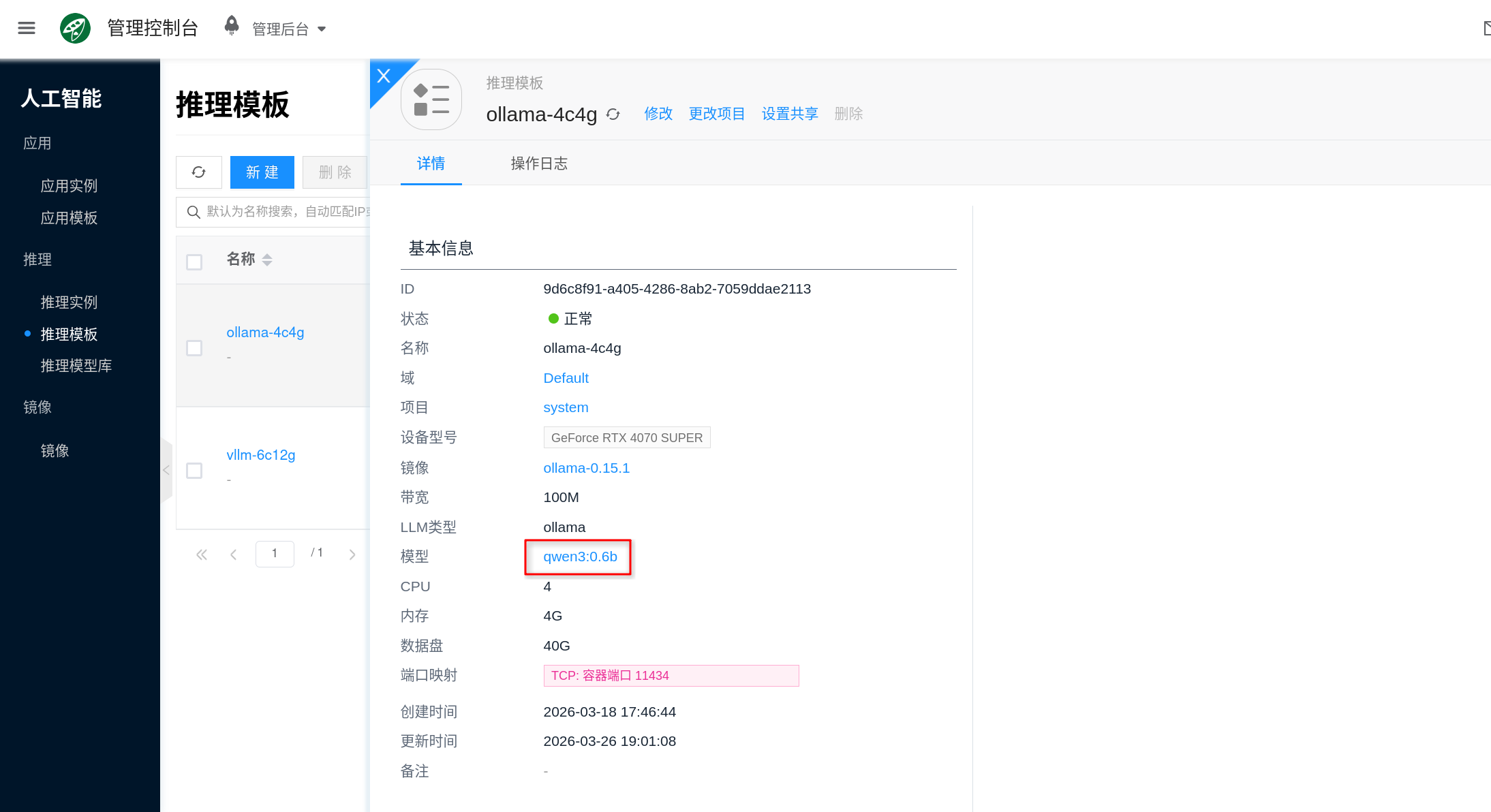 它可以理解为“推理实例的标准规格”。模板配置得越清晰,后续批量创建、扩容、回滚和排障就越稳定。当前文档以 Ollama 模板为例介绍推理模板的使用方式,其他推理引擎后续补充。