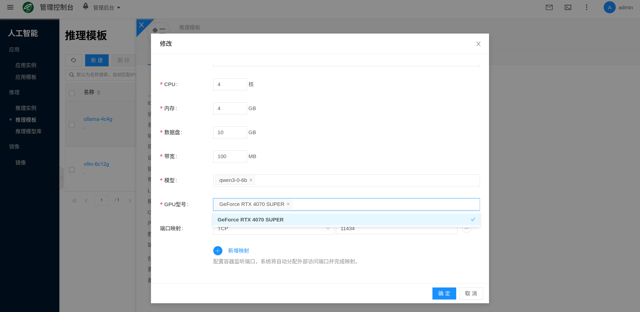 3. 填写模板配置:按需要设置类型、镜像、CPU、内存、数据盘、GPU、端口映射和挂载模型等字段。