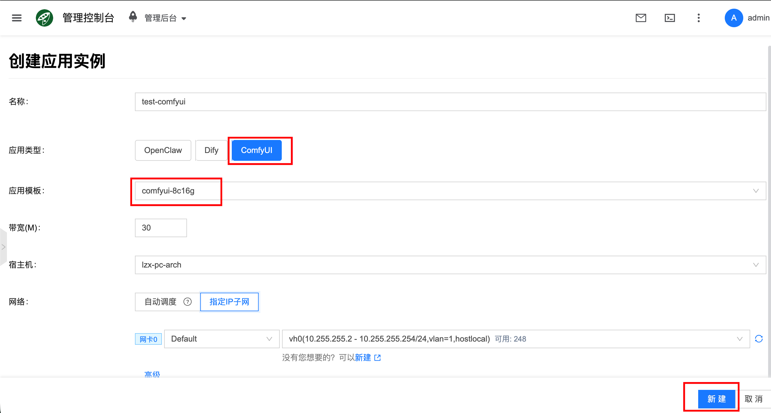 After updating the default template's GPU model, go to Artificial Intelligence → Applications → Application Instances, create a new instance, and select the updated comfyui-8c16g template.
