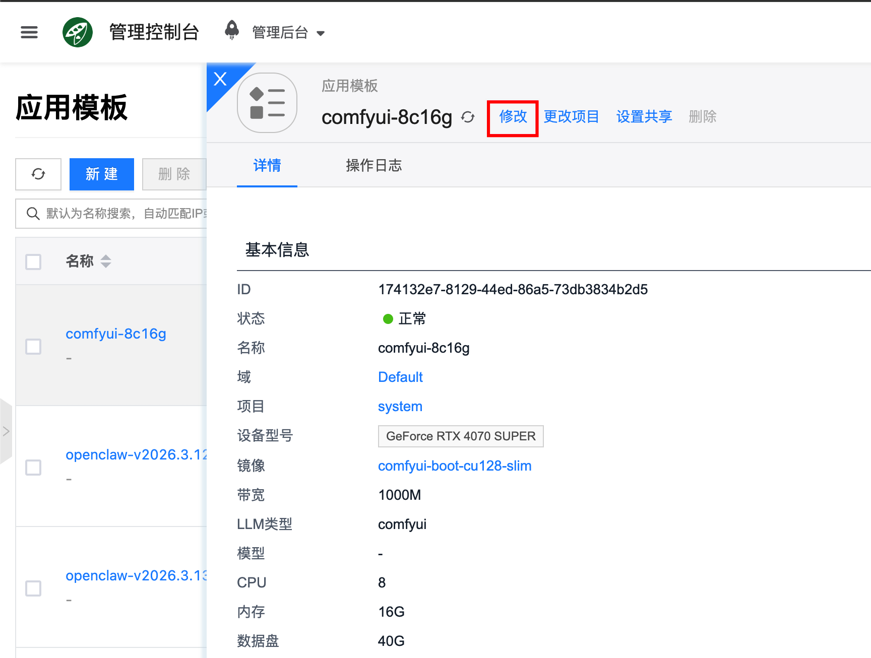 After configuring the GPU environment, simply update the GPU model in the platform's default ComfyUI template comfyui-8c16g. The process is as follows: