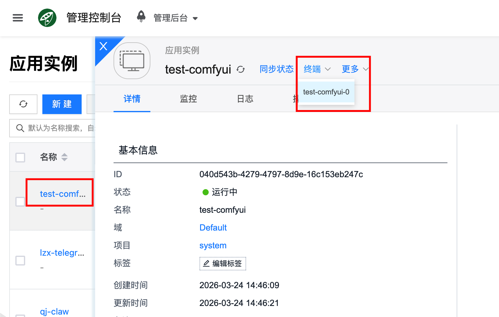 Via the frontend interface: Click the corresponding application instance, go to the details page, then click Logs to view the service output logs, which is useful for troubleshooting.