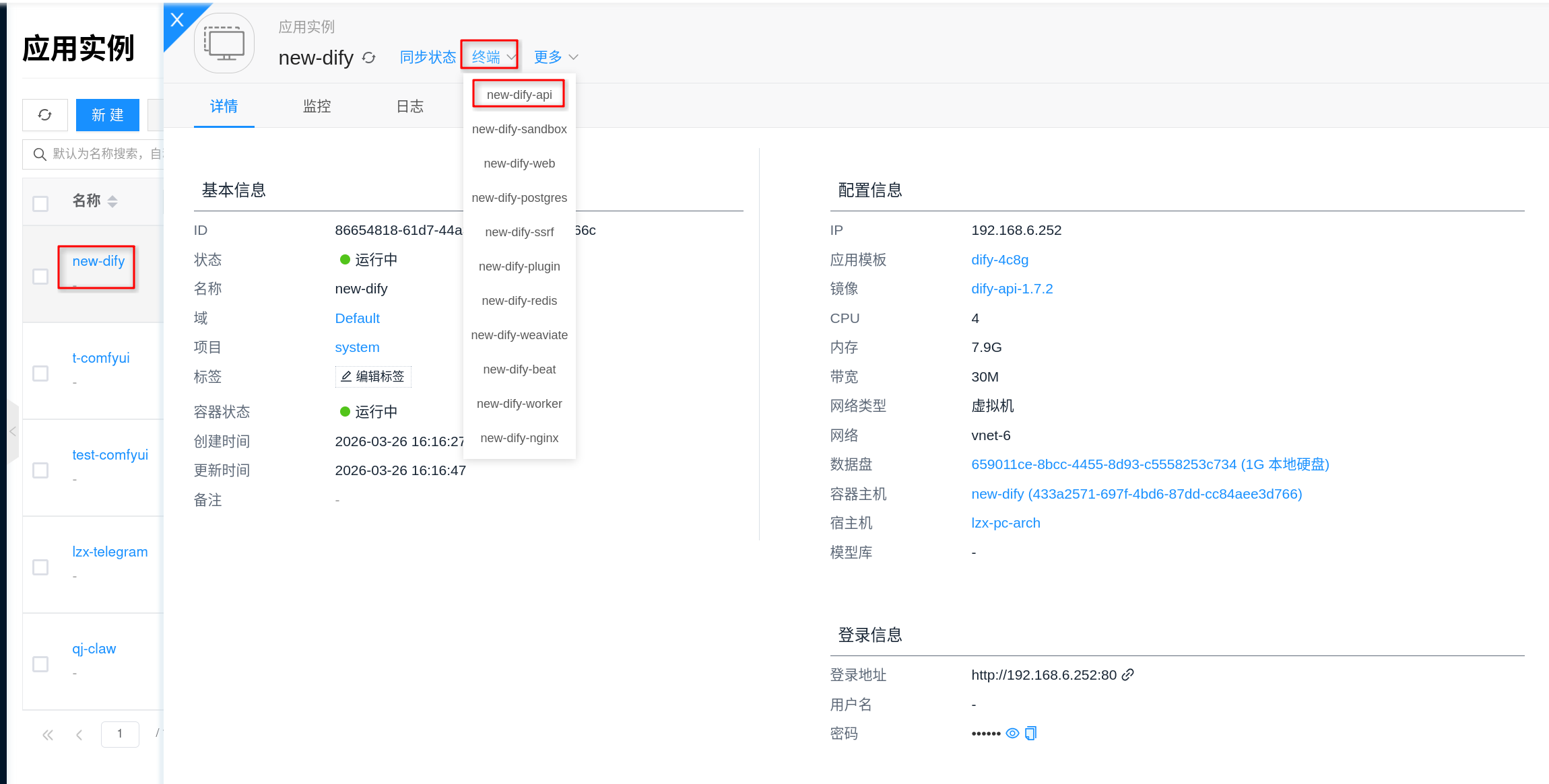 Per the current platform implementation, Dify's main container is typically the api container, so entering the terminal from the details page usually puts you in the backend service runtime environment.