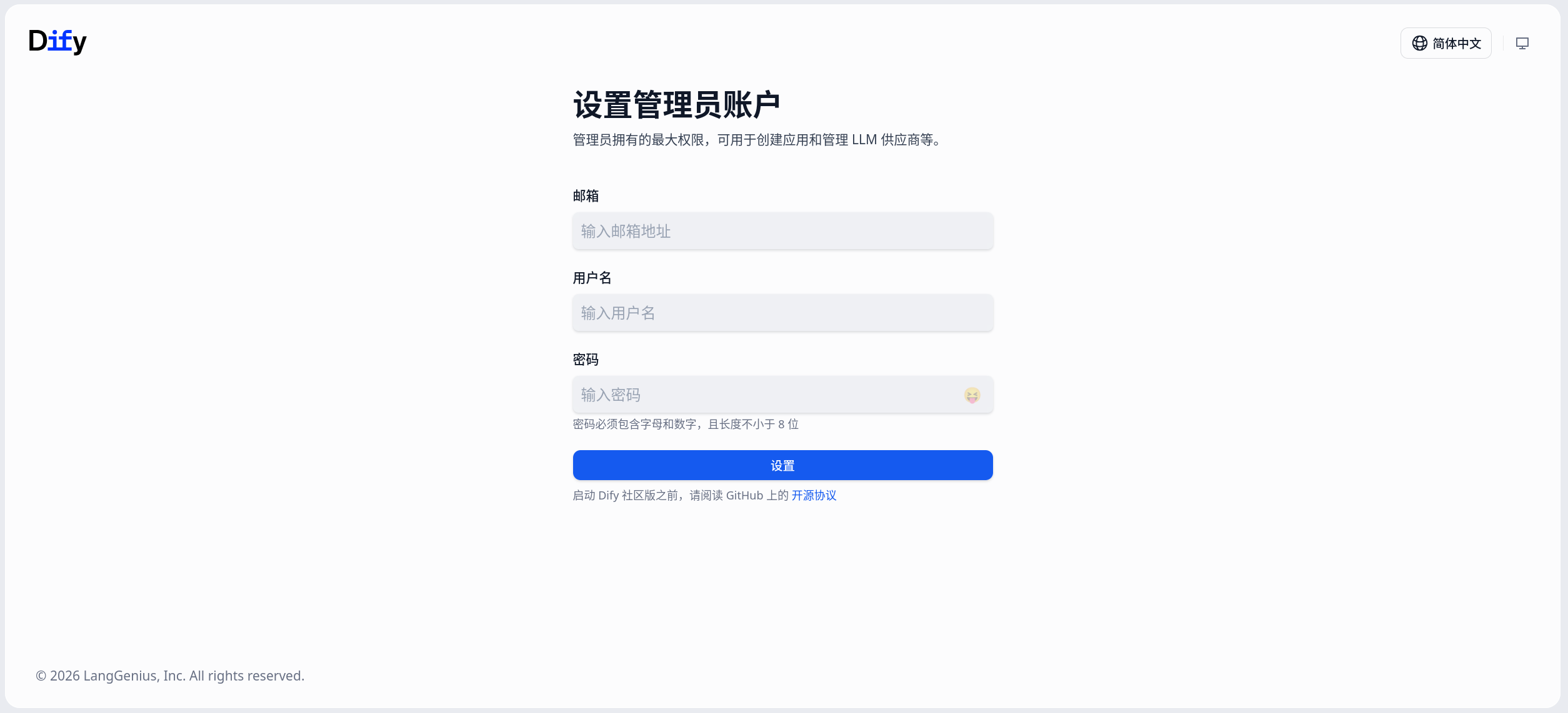 After opening the access URL in a browser, you will typically see the Dify first-time initialization wizard. You can follow the on-screen prompts to complete the following actions: