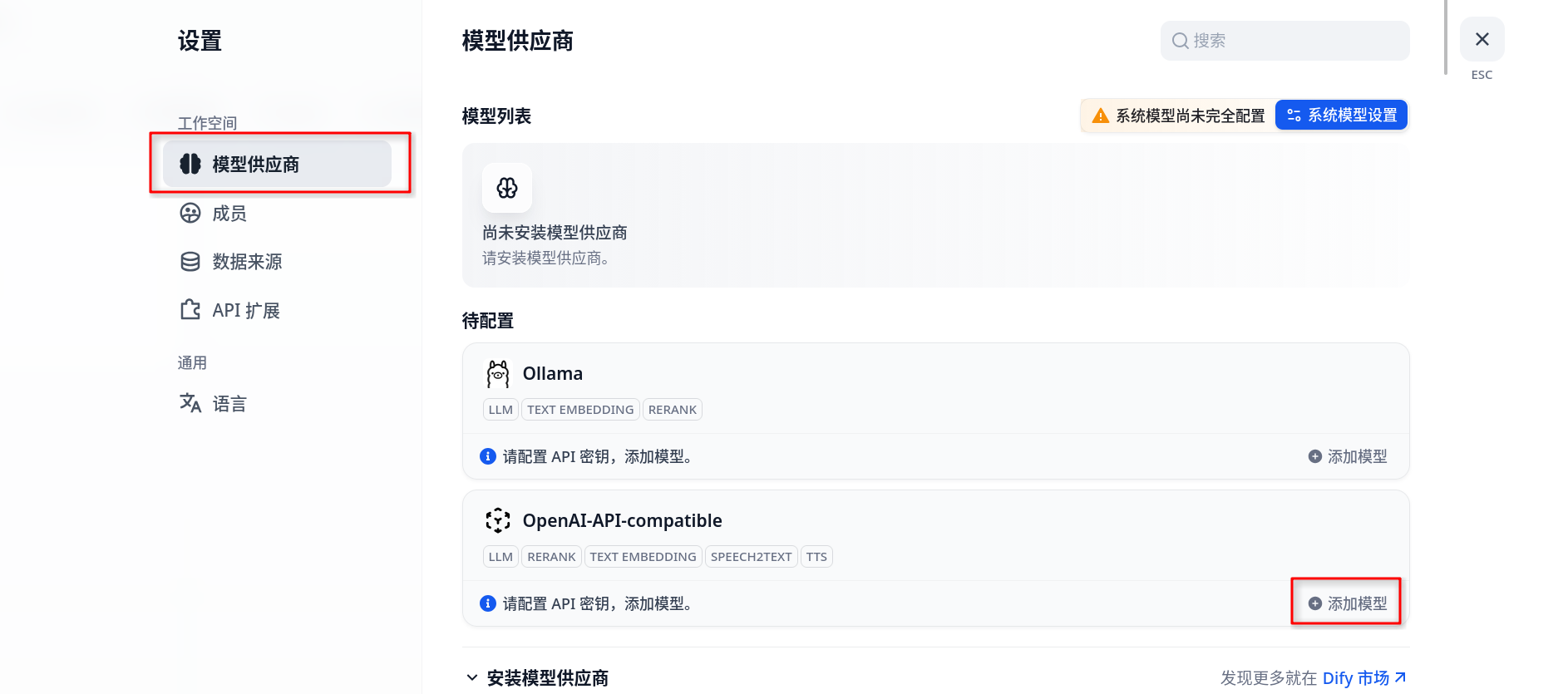 OpenAI,OpenAI-API-compatible, orOllama. - After the plugin is installed, go to the model configuration page of the model provider.