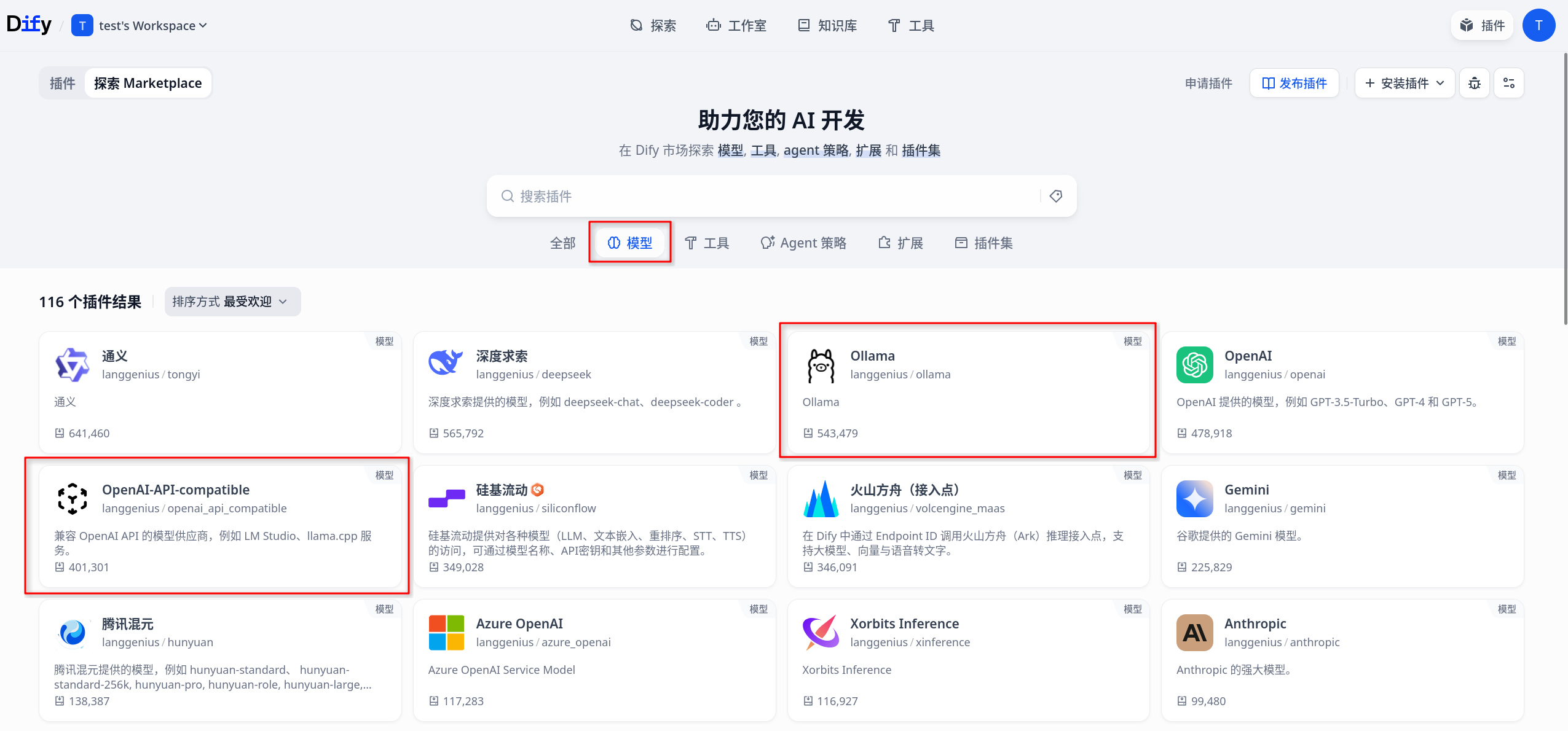 OpenAIorOpenAI-API-compatibleplugin in Dify's Plugins → Marketplace, then fill in the official or compatible service address. - Ollama integration: If connecting to platform-internal inference instances, it is recommended to first verify their availability, then install the corresponding plugin in Dify's Plugins → Marketplace, and finally return to the model provider page to complete the integration.