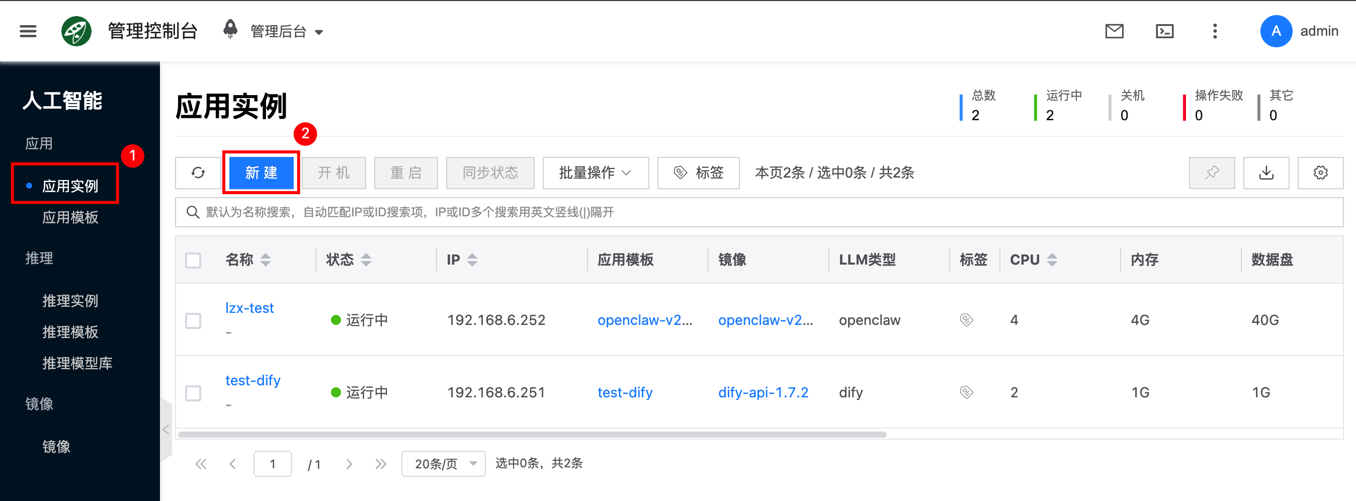 - Create an application instance: In the console, go to Artificial Intelligence → Applications → Application Instances, create a new instance and select the Dify template.