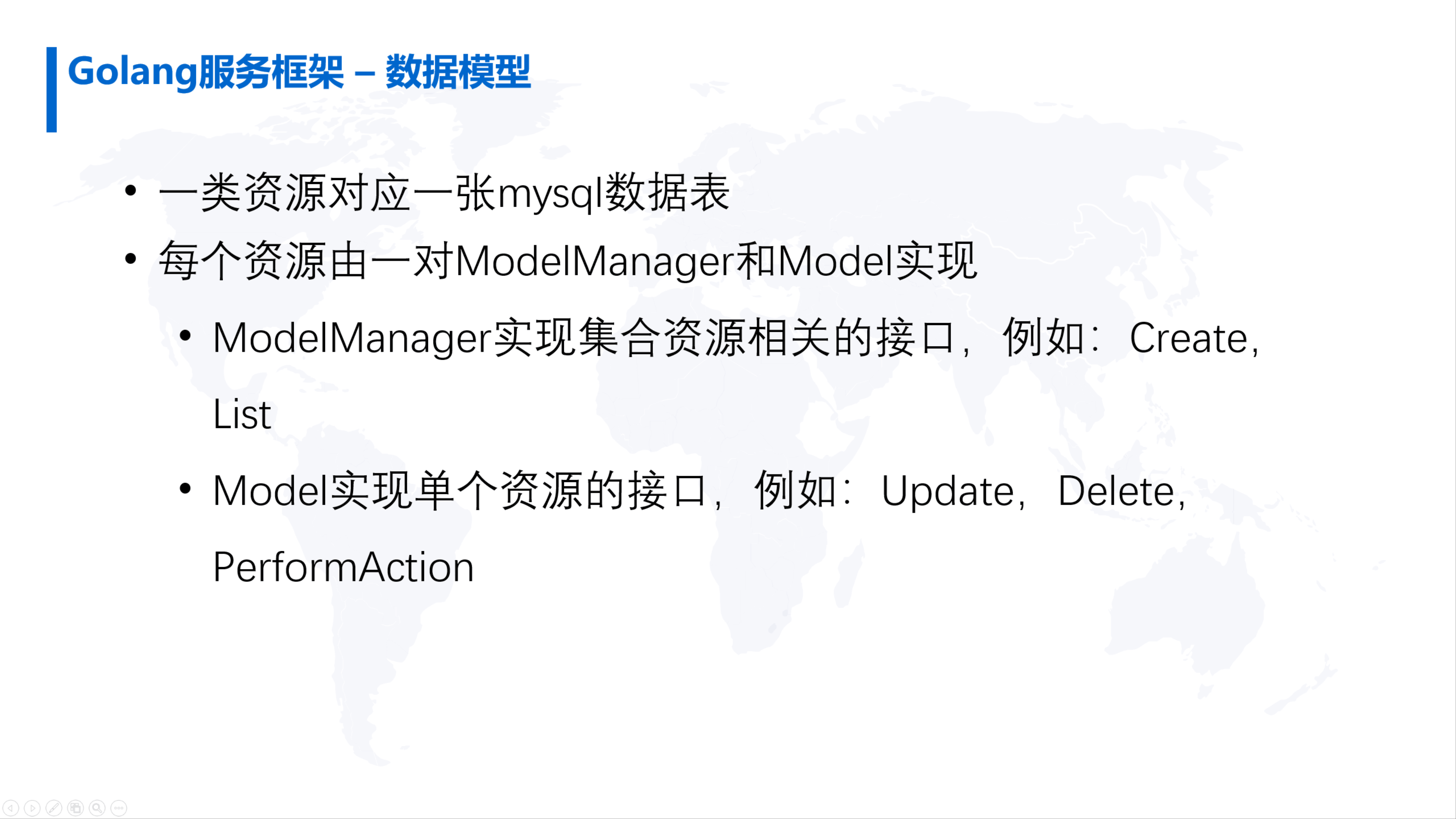 为了比较方便地实现对数据库MySQL记录的操作,针对每一个资源,都会对应到一对ModelManager和Model的数据结构。ModelManager数据结构对实现一类资源的集合操作,例如创建资源或者列表,而针对单个资源的操作,则通过Model来实现,实现对单个具体资源的更新、删除的操作。