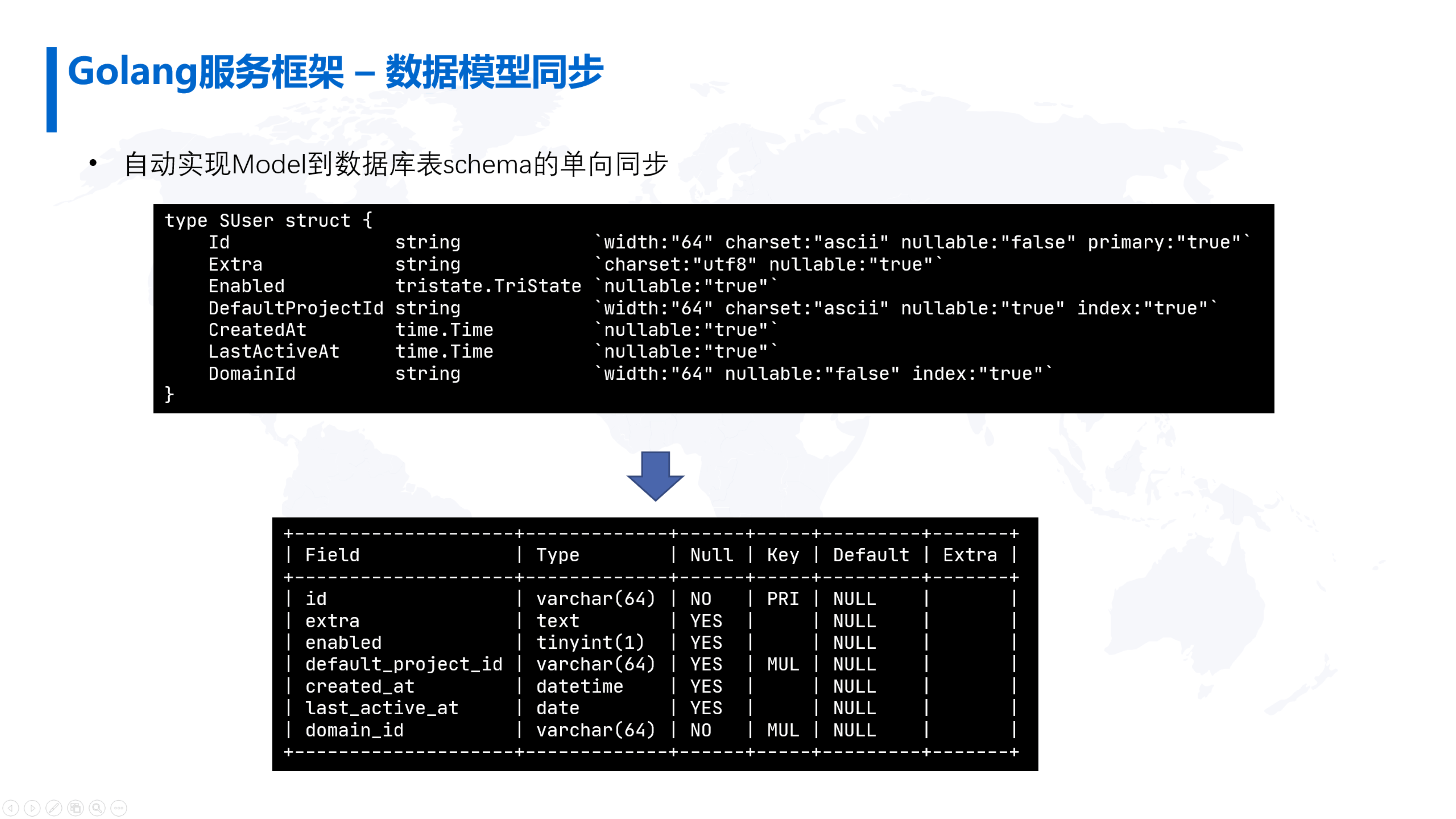 Sqlchemy实现了Golang的数据结构到MySQL表单向同步,能够根据结构体字段的定义以及字段中tag的定义,生成精确的MySQL的schema。