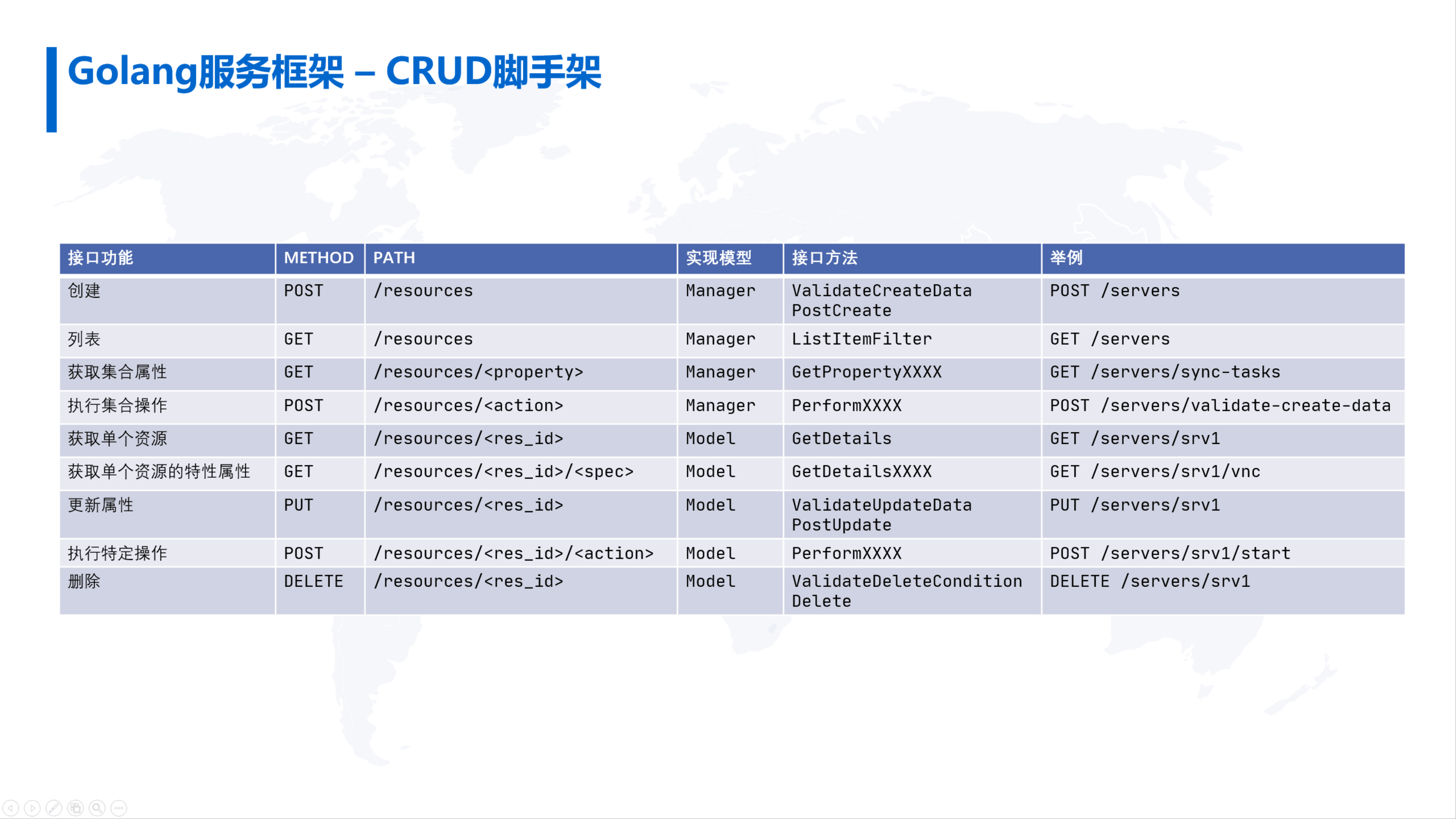与此同时,每类资源都会提供一系列的API,此处列出了对一个资源会实现的九类API,包括创建、删除、更新、执行操作、获取详情、列表等操作。