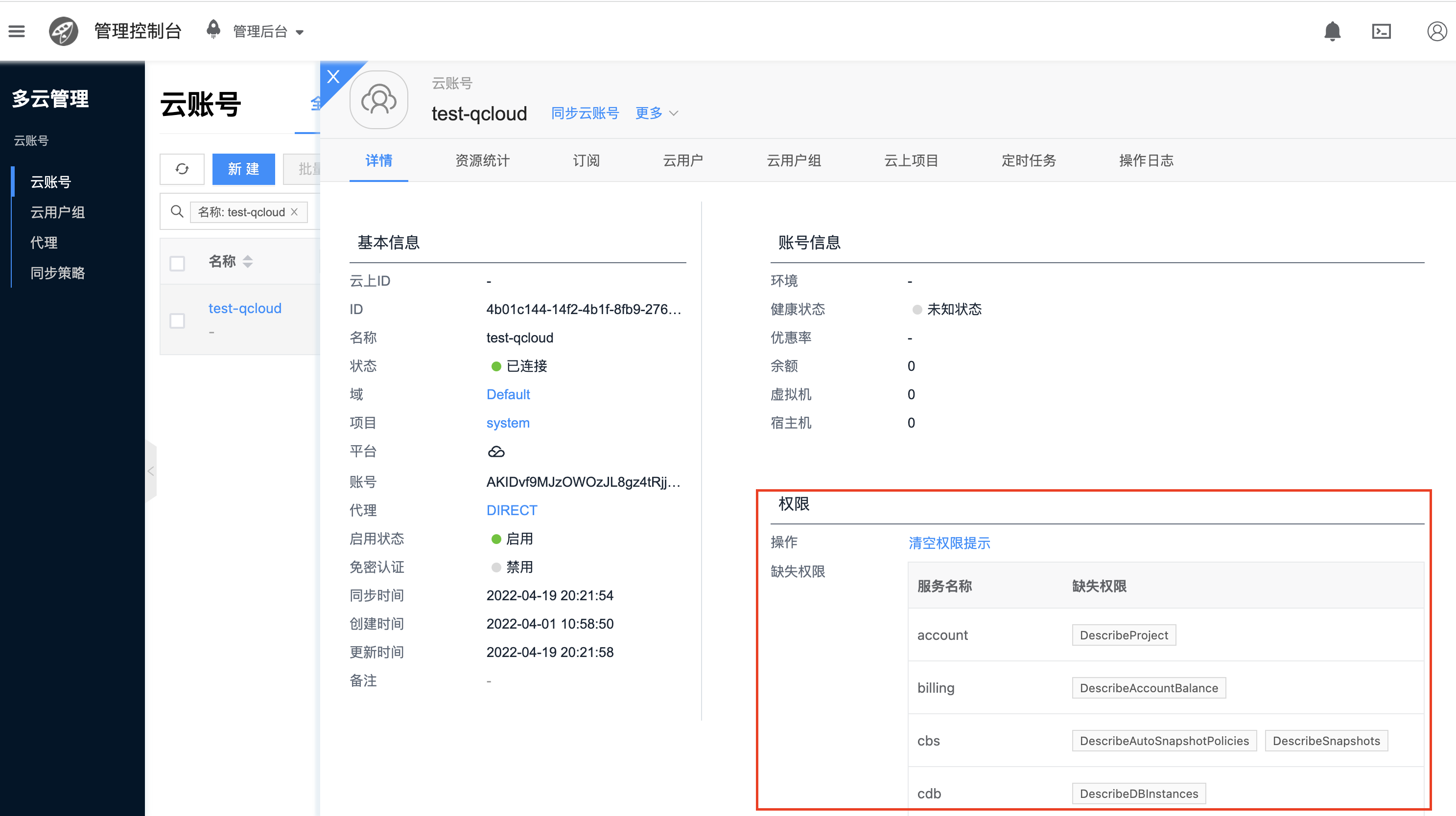 • 打开云账号详情标签页, 查看是否有截图中提示的缺少权限