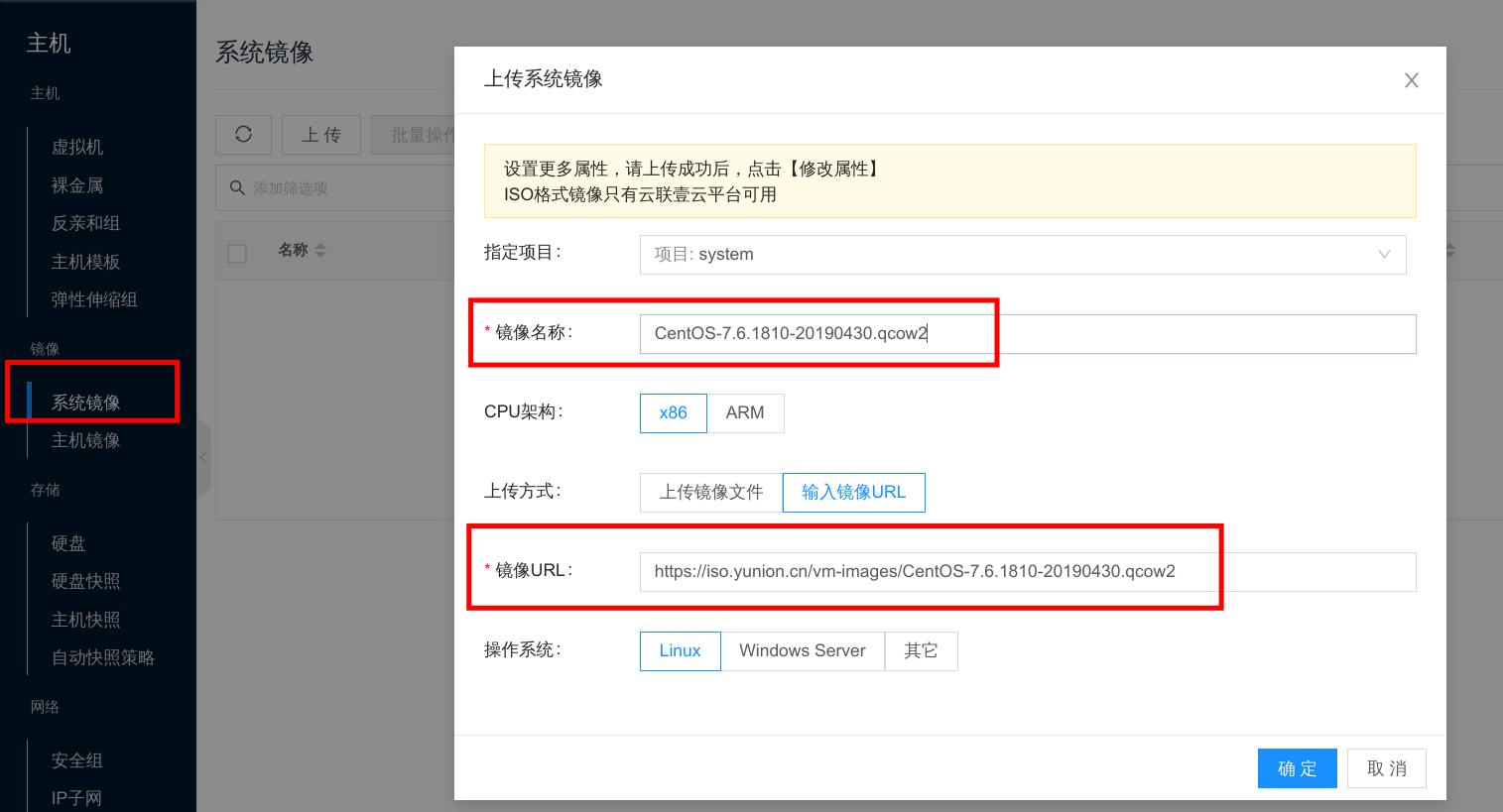 - 上传方式选择 '输入镜像URL',镜像 URL 为: https://iso.yunion.cn/vm-images/CentOS-7.6.1810-20190430.qcow2