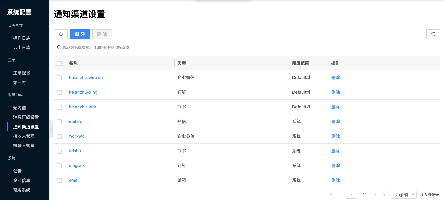 - 归属:设置通知渠道的归属。当通知渠道归属于系统时,则全局可用;当通知渠道归属于域时,则域下可用;其中邮箱、短信只允许归属于系统,钉钉、飞书、企业微信可以归属于系统或域,当同时在系统和域配置了钉钉、飞书、企业微信时,以域下配置的为准。