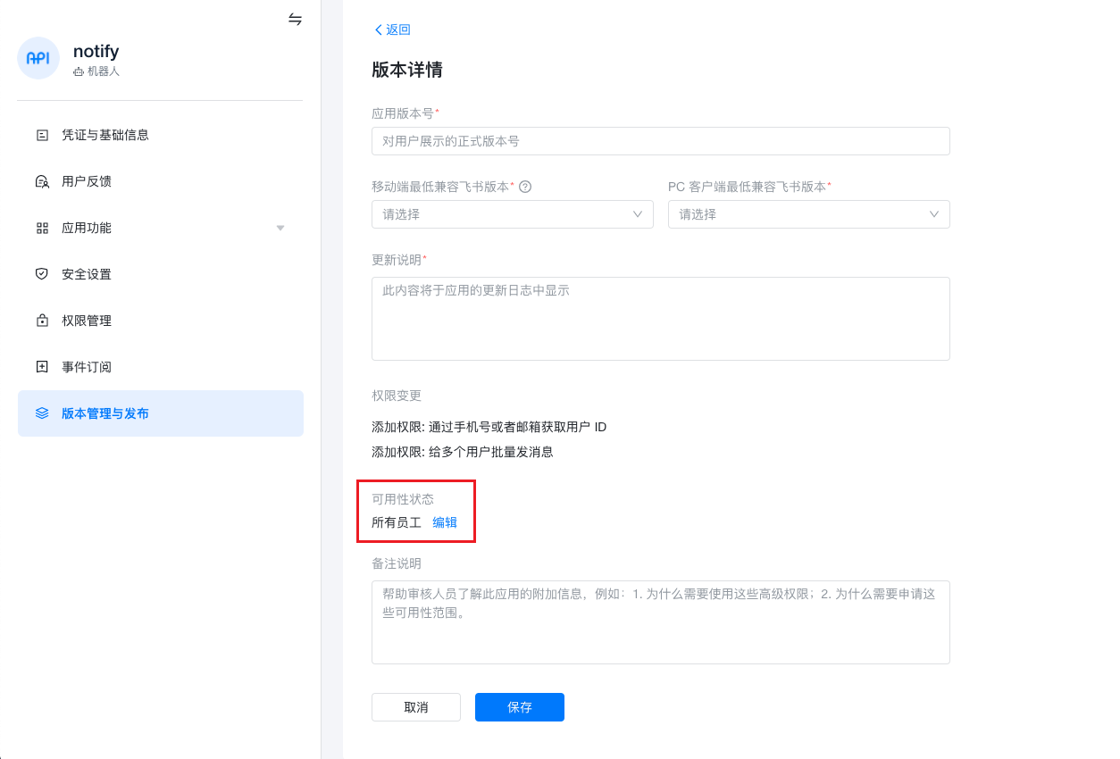 在版本管理与发布页面,创建版本,配置相关信息,注意将可用性状态设置为“所有员工”或应用适用的组织,单击 "保存" 按钮,待管理员审核发布应用。