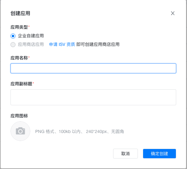 设置应用类型为“小程序”,根据需求设置应用名称、描述、图标等,单击 "确定创建" 按钮,。