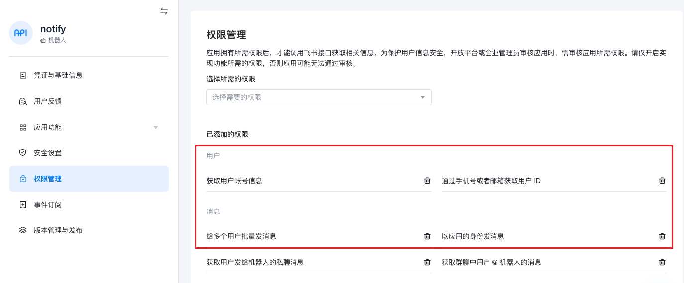 在权限管理中根据需要为应用添加权限,至少添加“获取用户账号信息”、“通过手机号或者邮箱获取用户 ID”、“给多个用户批量发消息”、“以应用的身份发消息”,其他权限请按需添加。