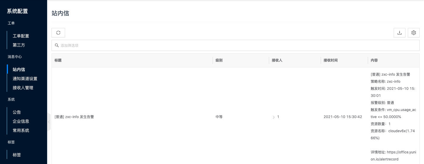 • 在云管平台单击左上角导航菜单,在弹出的左侧菜单栏中单击 "系统配置/消息中心/站内信" 菜单项,进入站内信页面。