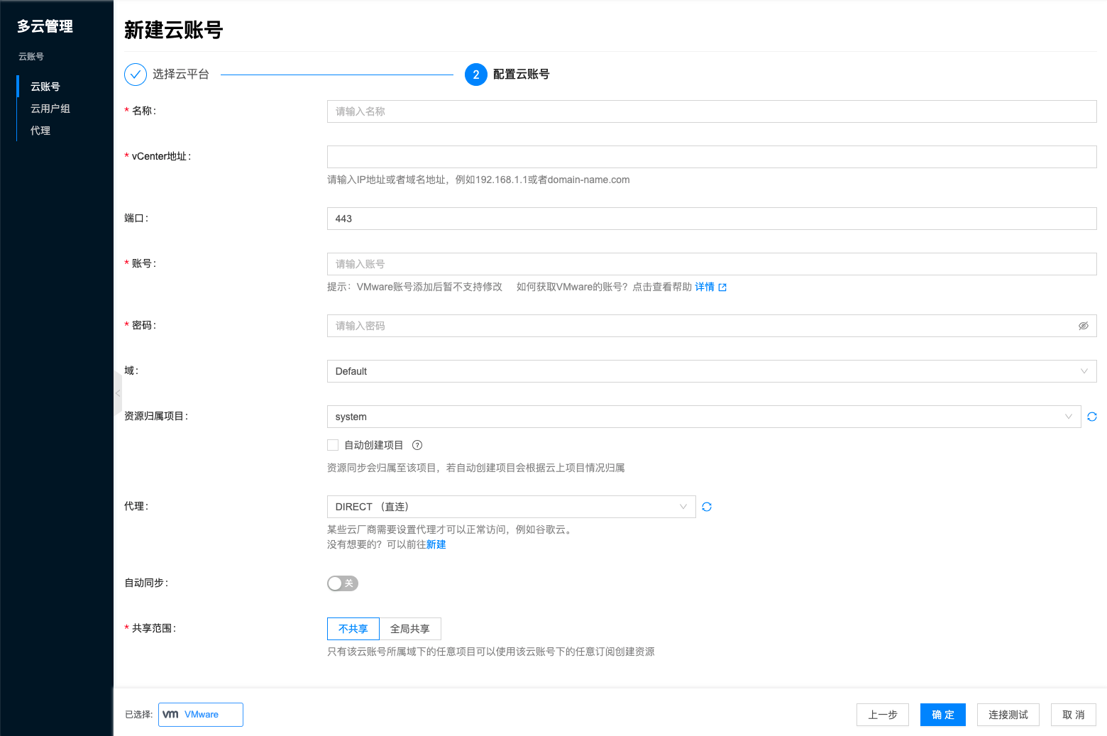 产品介绍VMware纳管本页总览VMware纳管VMware纳管 实现VMware vShpere虚拟化集群的自助服务和自动化。 添加VMware账号 VMware账号列表 自动创建二层网络 自动创建IP子网 新建VMware虚拟机