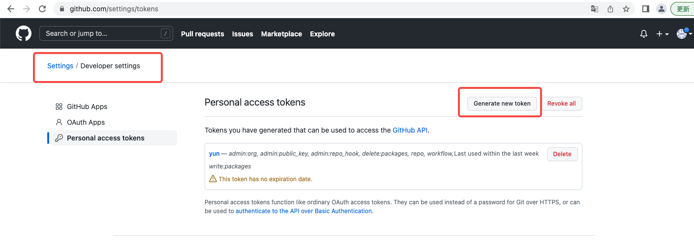 github->个人中心->settings->developer settings ->personal access tokens->generate new token