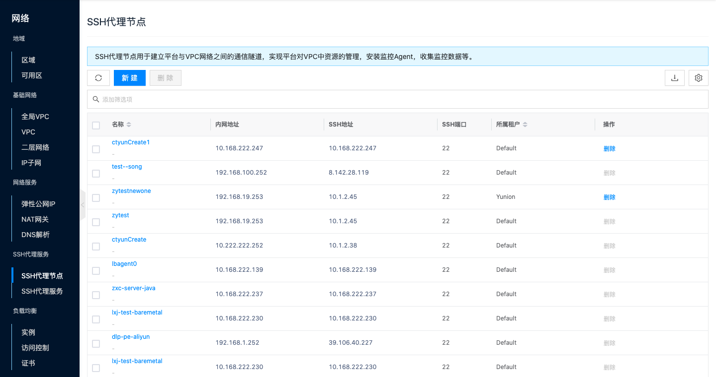 - 在SSH代理节点页面,单击SSH代理节点右侧操作列 "删除" 按钮,弹出操作确认对话框。