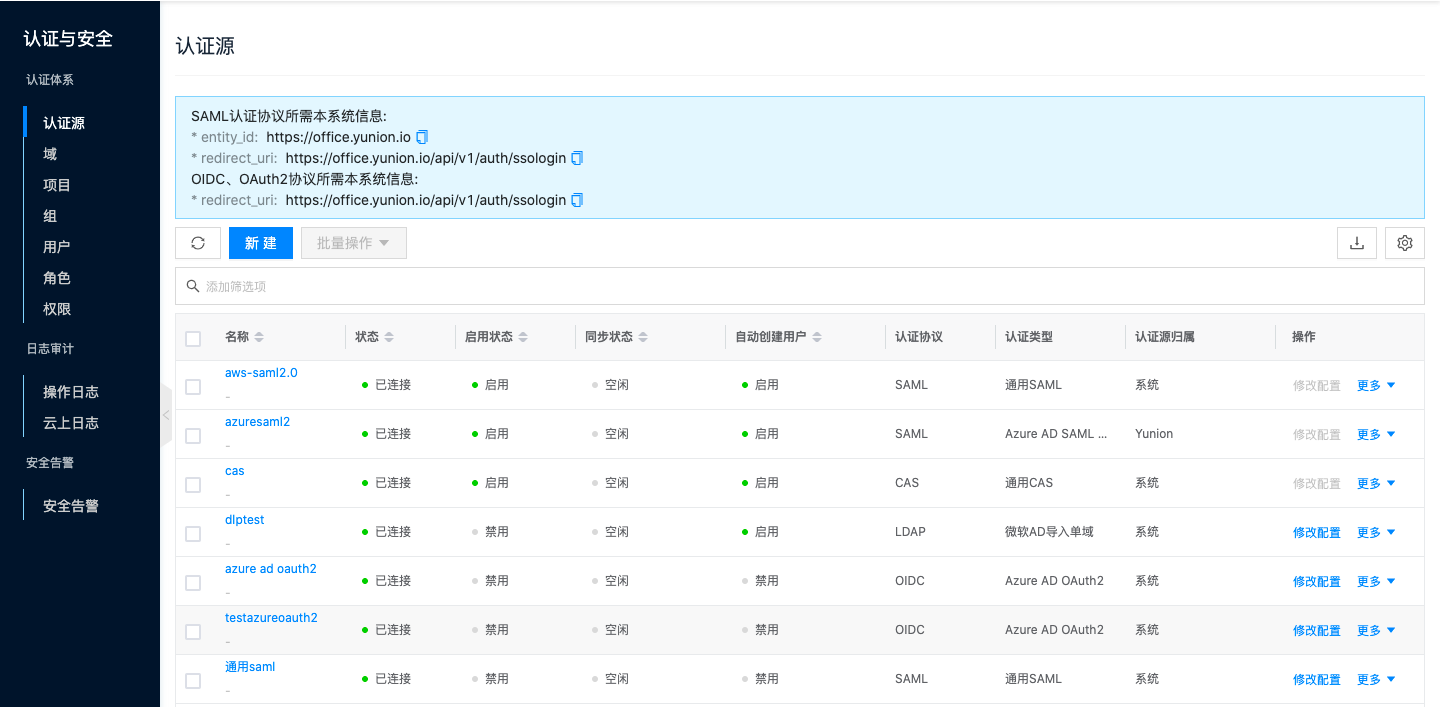 入口:在云管平台单击左上角导航菜单,在弹出的左侧菜单栏中单击 "认证与安全/认证体系/认证源" 菜单项,进入认证源页面。