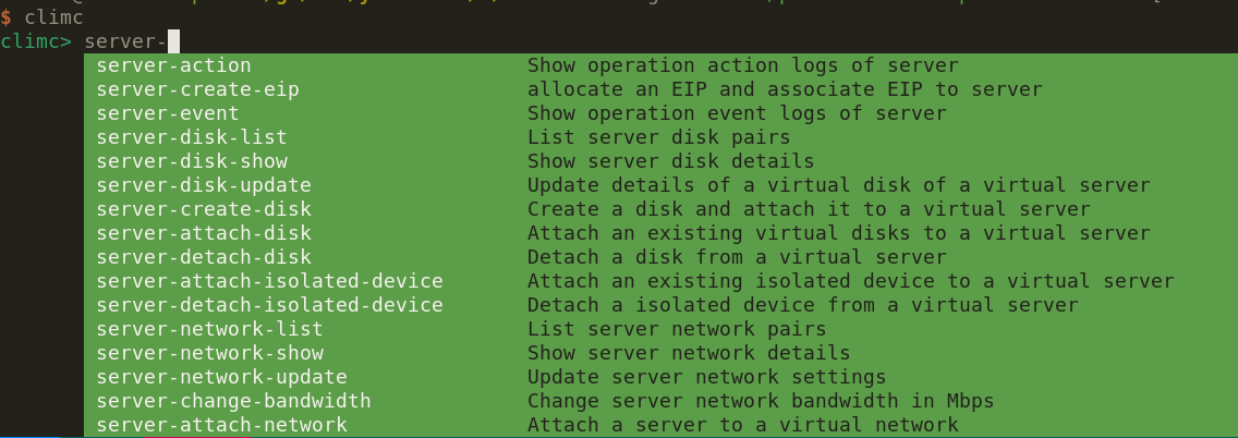• 交互模式: 在 shell 输入 climc,就会进入交互模式,这种模式下有自动补全和参数提示。