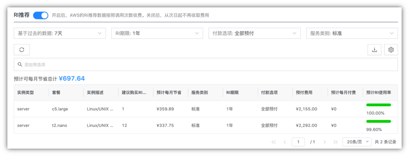 2.1 支持AWS的预留实例分析,包括RI推荐及RI覆盖率,帮助客户用好RI,节约成本