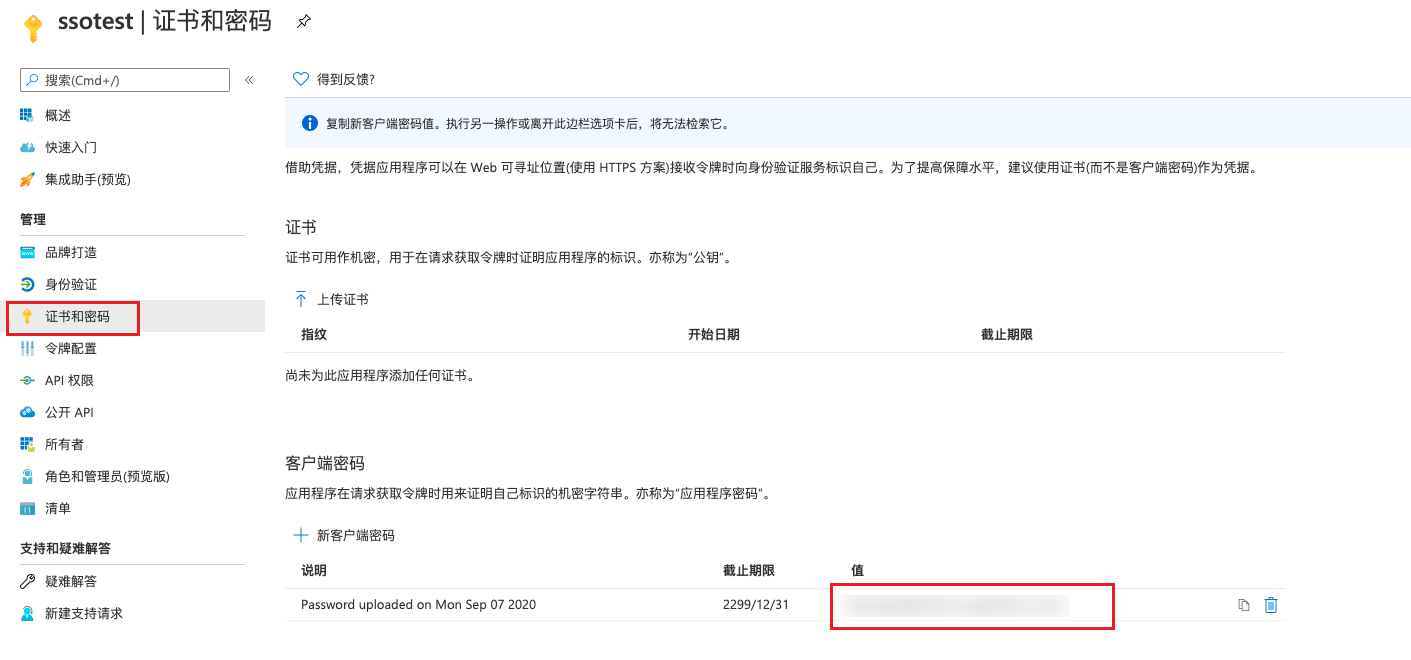 2. In the left menu items, select the Certificates and Secrets menu item, create a new client secret, and after successful addition, obtain ClientSecret (client secret).