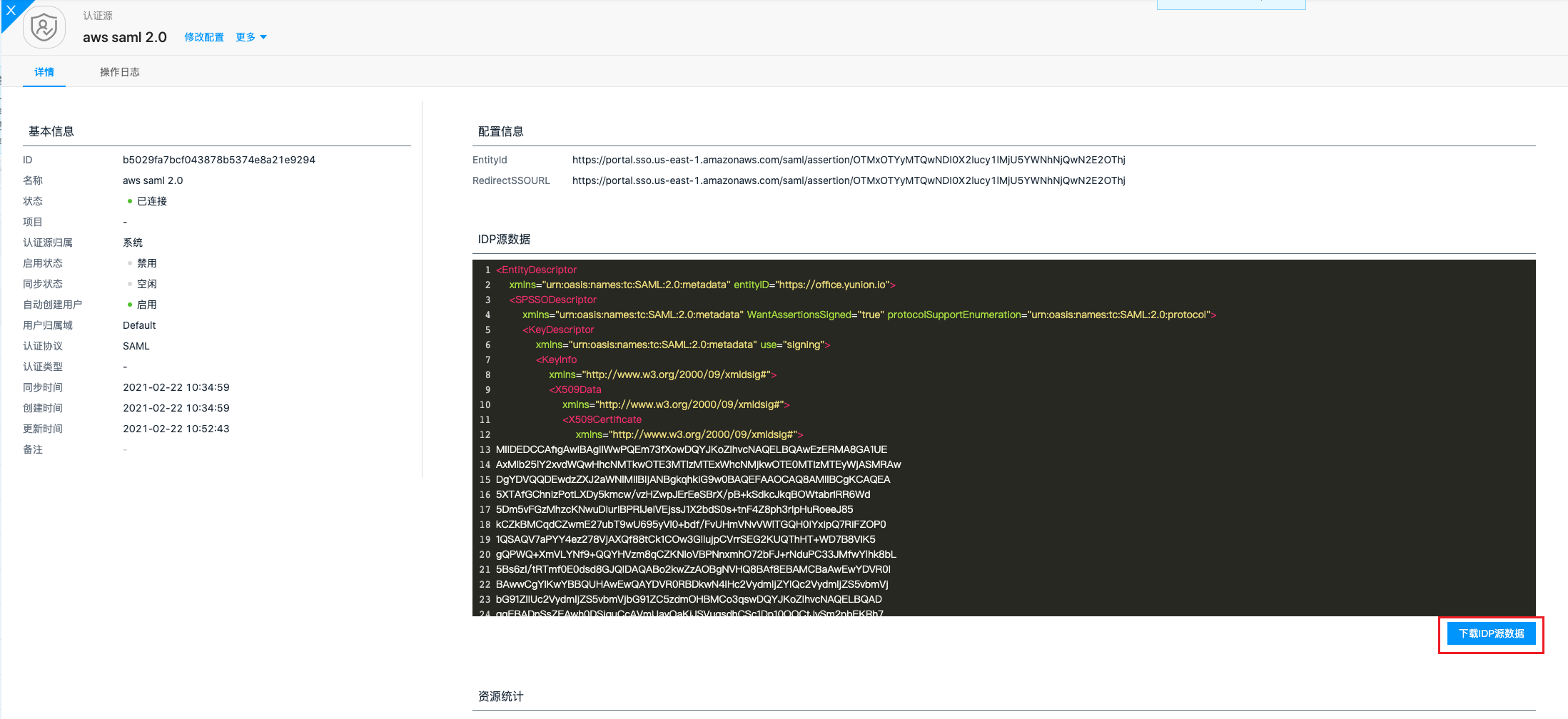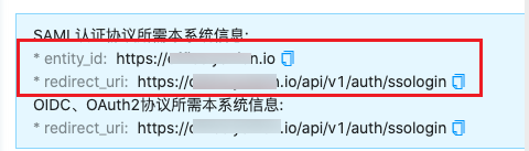 Above the list, EntityID and Redirect_url (callback address) required by SAML protocol and OIDC and OAuth2 protocols will be displayed, and copying is supported.