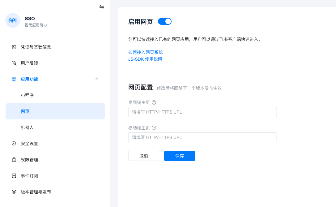 4. In Application Features - Web, enable web, and add the platform's access address in the desktop homepage in web configuration.