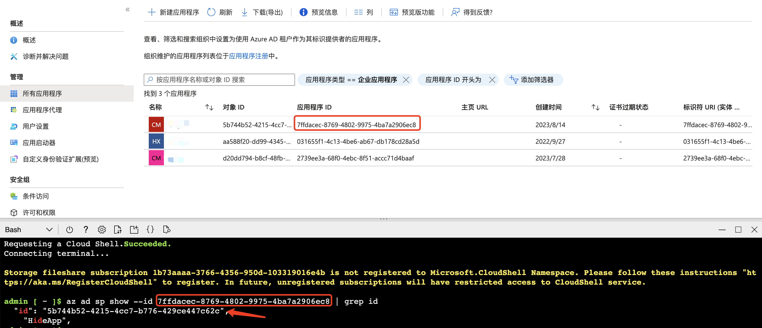 Go to Azure Active Directory => App registrations, find the application in use, and obtain the Application (client) ID, then execute in cloud shell