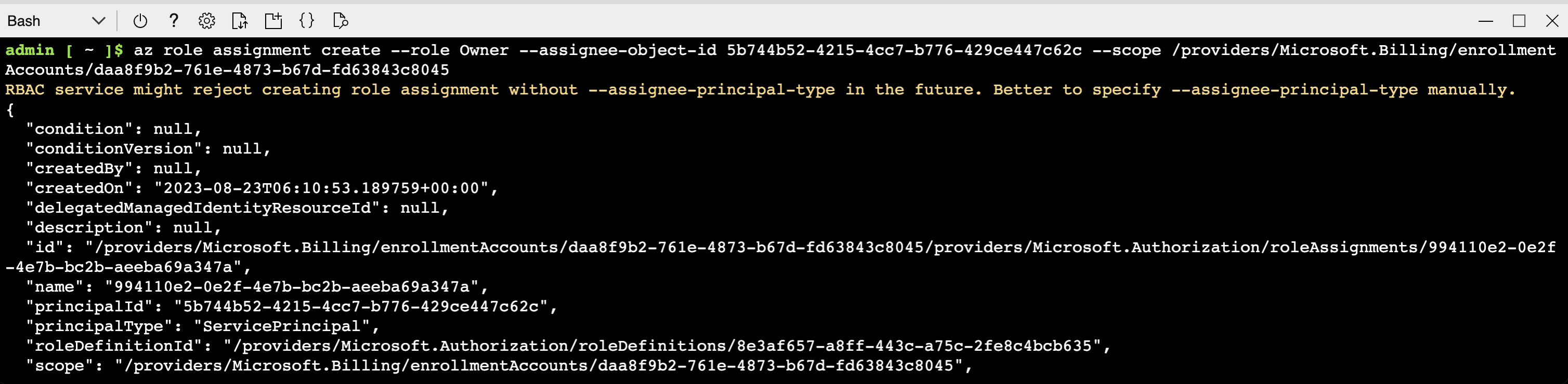 az role assignment create --role Owner --assignee-object-id 5b744b52-4215-4cc7-b776-429ce447c62c --scope /providers/Microsoft.Billing/enrollmentAccounts/747ddfe5-xxxx-xxxx-xxxx-xxxxxxxxxxxx