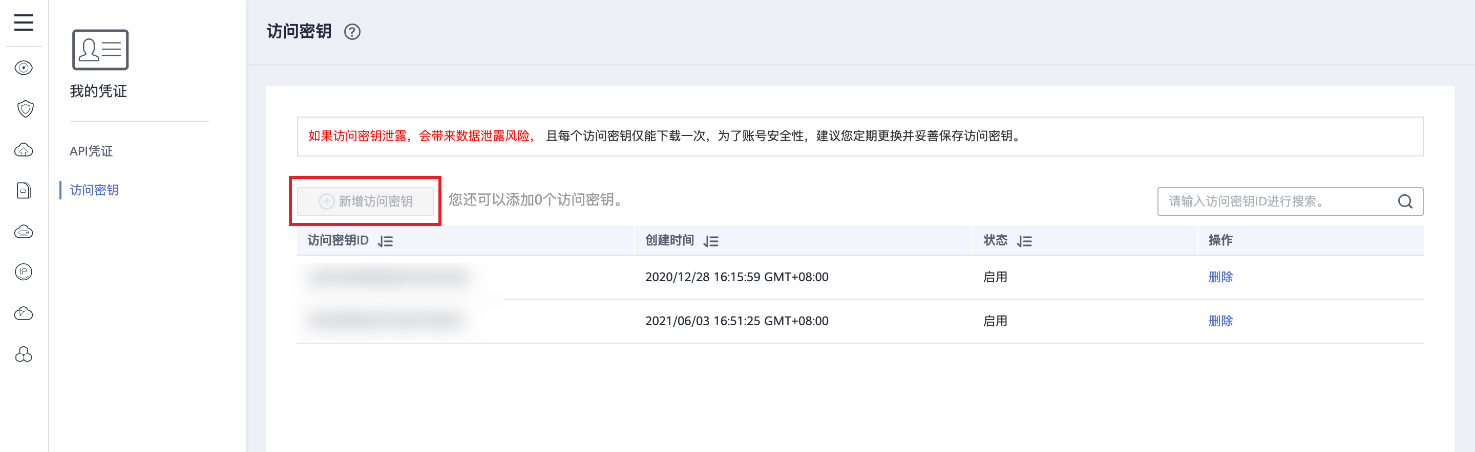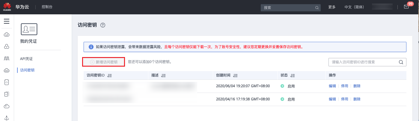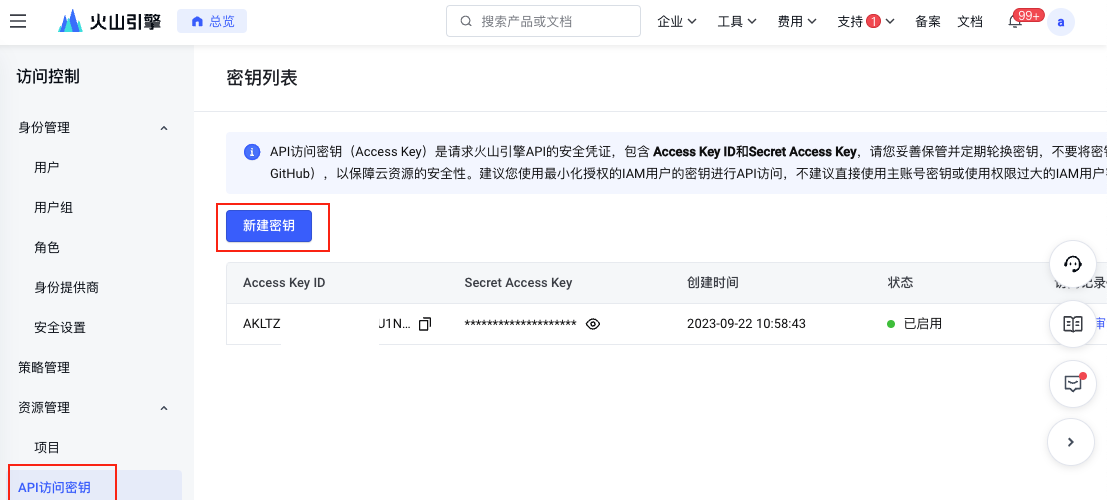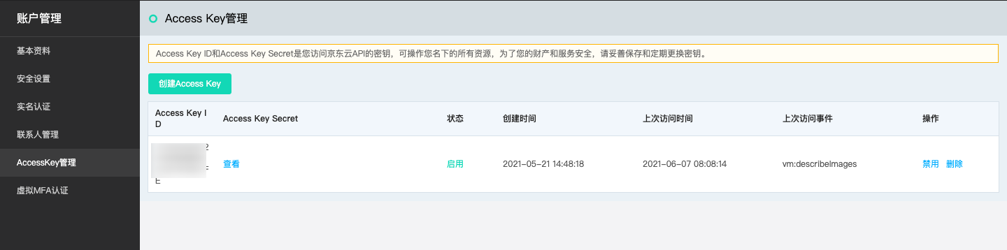 - 已创建的AccessKey,无法再查看AccessKeySecret。