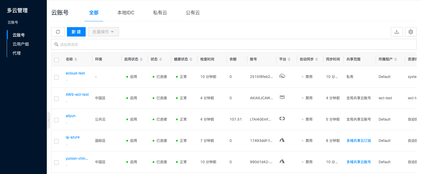 云账号用于与私有云和公有云平台建立连接,同步相关资源并进行管理。