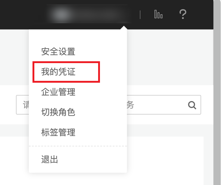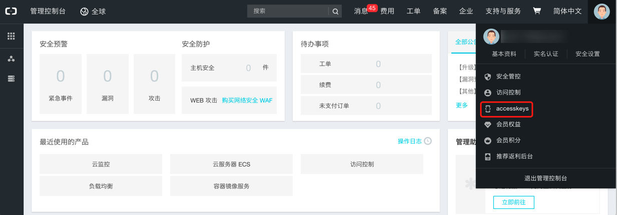使用主账号登录阿里云控制台,单击页面右上角个人信息,展开下拉菜单,单击 _"accesskeys "_** 菜单项进入安全信息管理页面。
