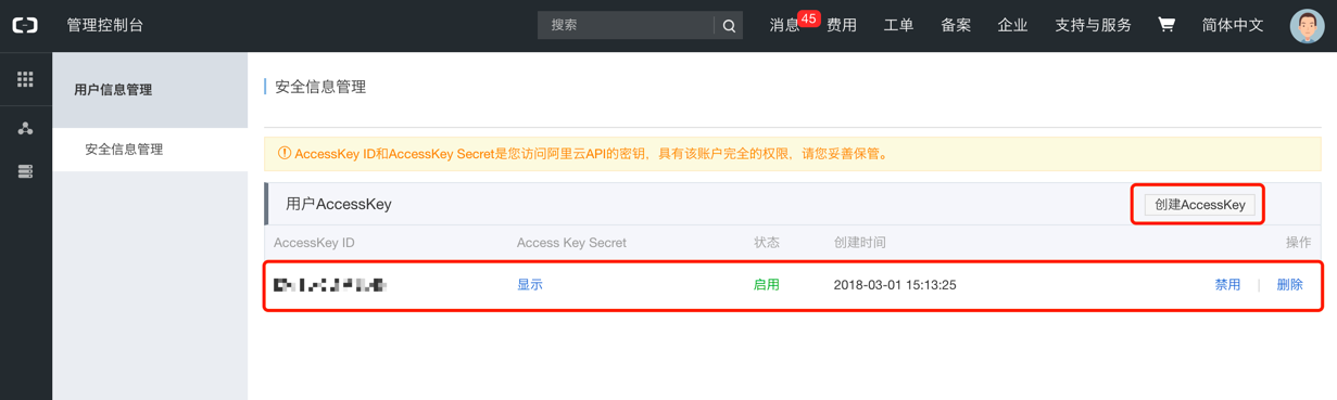 在安全信息管理页面,可以查看已存在的AccessKey信息,也可以单击 "创建AccessKey" 按钮新建用户AccessKey,新建AccessKey时阿里云会向账号联系人手机发送验证码,验证通过后才可以创建AccessKey。