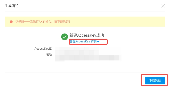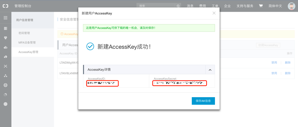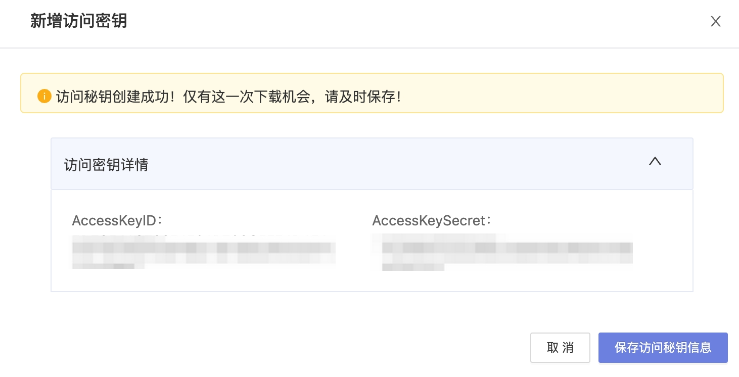 创建成功后,AccessKeySecret信息只会展示一次,请及时保存。